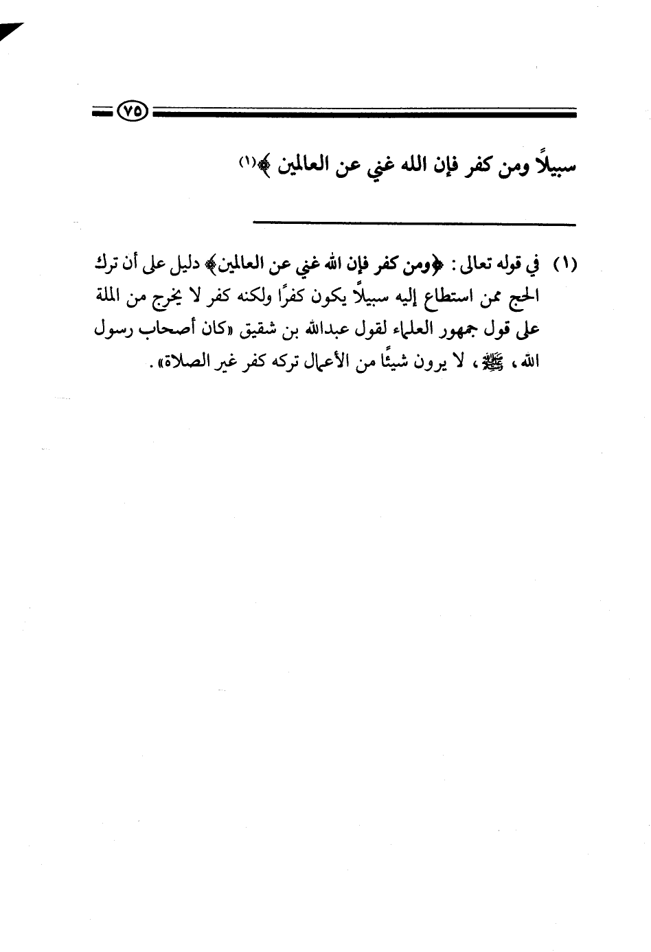 (4) في قوله تعالى {وَمَنْ كَفَرَ فَإِنَّ اللَّهَ غَنِيٌّ عَنِ الْعَالَمِينَ} دليل على أن ترك الحج ممن استطاع إليه سبيلا يكون كفرا ولكنه كفر لا يخرج من الملة على قول جمهور العلماء لقول عبد الله بن شقيق: "كان أصحاب رسول الله صَلَّى اللَّهُ عَلَيْهِ وَسَلَّمَ لا يرون شيئا من الأعمال تركه كفر غير الصلاة".