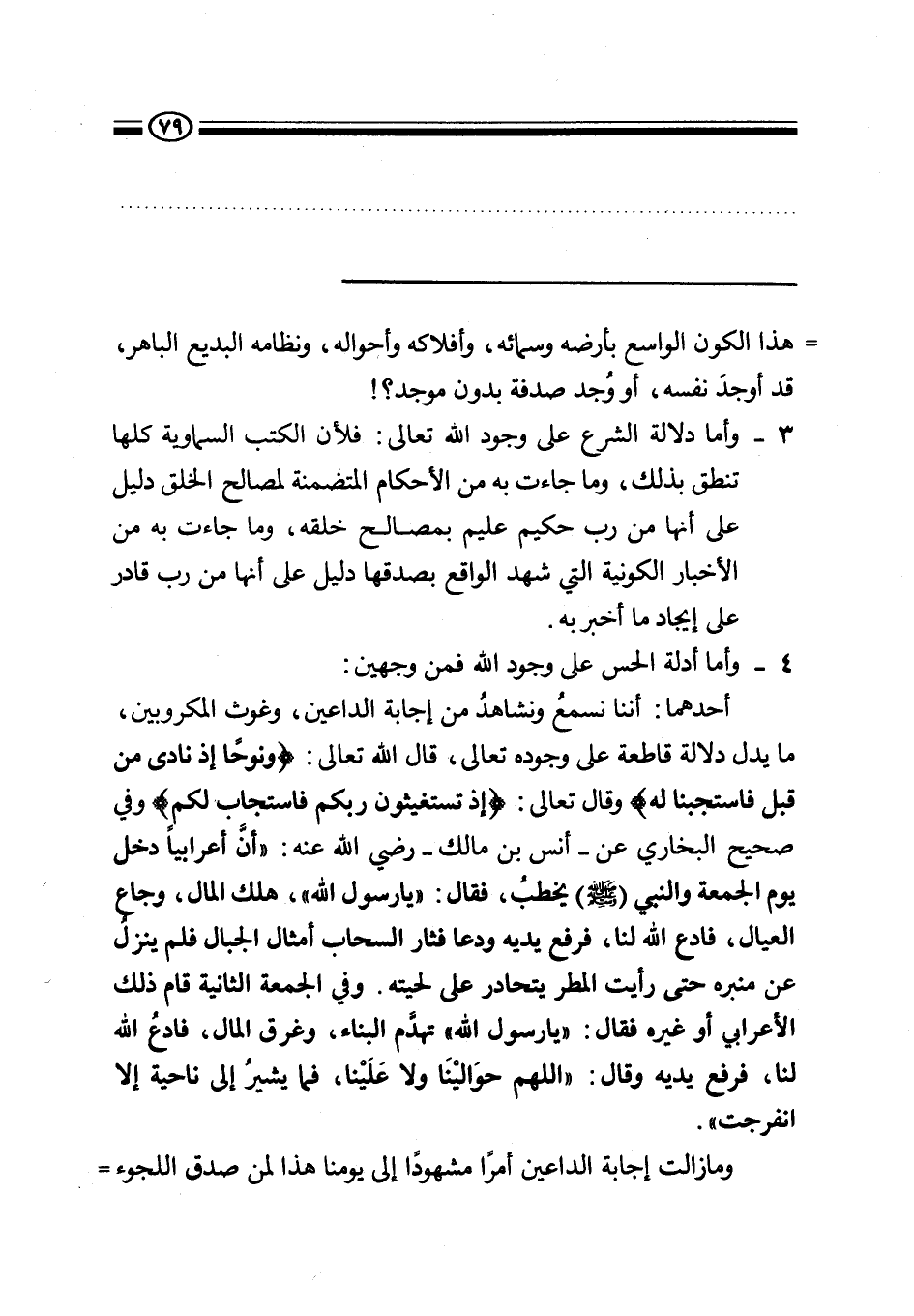 أحدهما: أننا نسمع ونشاهد من إجابة الداعين، وغوث المكروبين، ما يدل دلالة قاطعة على وجوده تعالى، قال الله تعالى: {وَنُوحًا إِذْ نَادَى مِنْ قَبْلُ فَاسْتَجَبْنَا لَهُ} وقال تعالى: {إِذْ تَسْتَغِيثُونَ رَبَّكُمْ فَاسْتَجَابَ لَكُمْ} وفي صحيح البخاري عن - أنس بن مالك - رضي الله عنه: «"أن أعرابيا دخل يوم الجمعة والنبي صَلَّى اللَّهُ عَلَيْهِ وَسَلَّمَ يخطب، فقال: (يا رسول الله) ، هلك المال، وجاع العيال، فادع الله لنا، فرفع يديه ودعا فثار السحاب أمثال الجبال فلم ينزل عن منبره حتى رأيت المطر يتحادر على لحيته. وفي الجمعة الثانية قام ذلك الأعرابي أو غيره فقال: (يا رسول الله) تهدم البناء وغرق المال، فادع الله لنا، فرفع يديه وقال: "اللهم حوالينا ولا علينا"، فما يشير إلى ناحية إلا انفرجت» (1) .