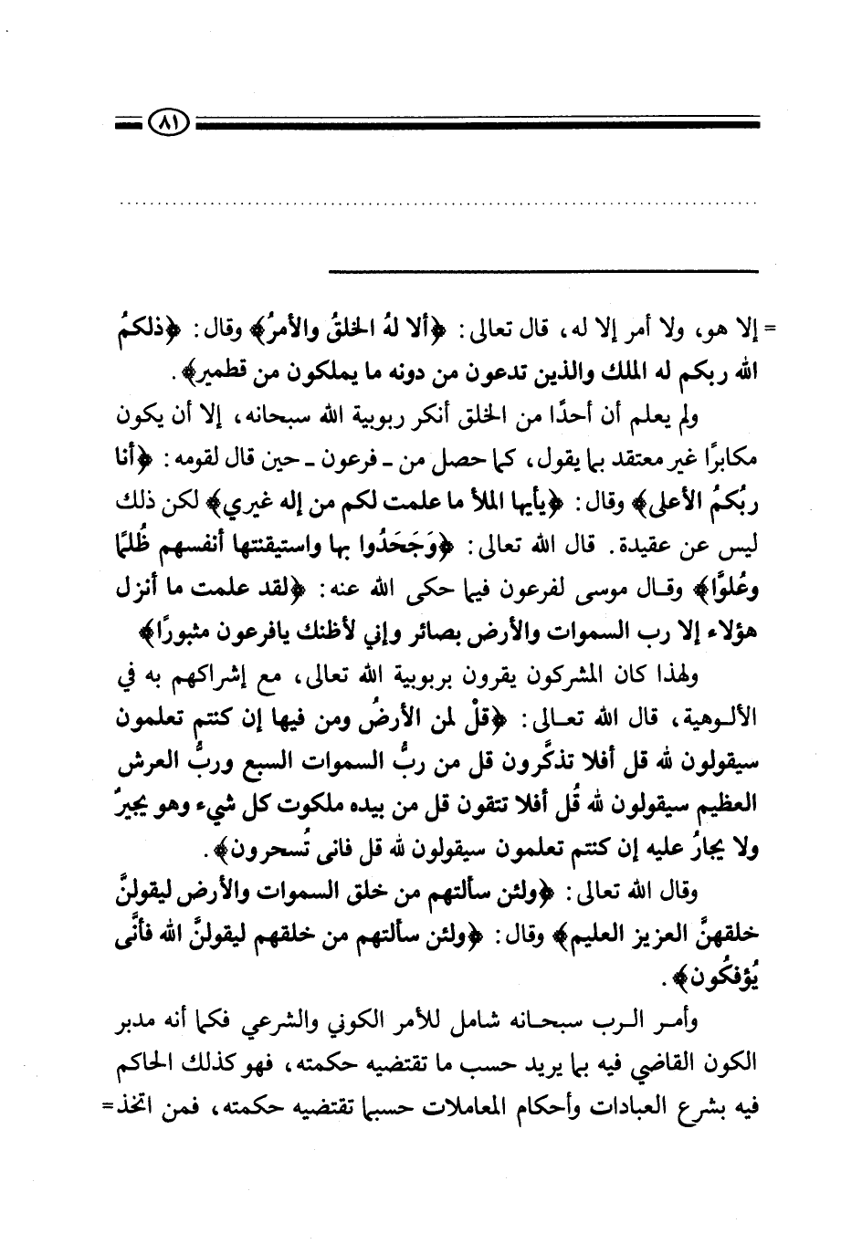 ولهذا كان المشركون يقرون بربوبية الله تعالى، مع إشراكهم به في الألوهية، قال الله تعالى: {قُلْ لِمَنِ الْأَرْضُ وَمَنْ فِيهَا إِنْ كُنْتُمْ تَعْلَمُونَ سَيَقُولُونَ لِلَّهِ قُلْ أَفَلَا تَذَكَّرُونَ قُلْ مَنْ رَبُّ السَّمَاوَاتِ السَّبْعِ وَرَبُّ الْعَرْشِ الْعَظِيمِ سَيَقُولُونَ لِلَّهِ قُلْ أَفَلَا تَتَّقُونَ قُلْ مَنْ بِيَدِهِ مَلَكُوتُ كُلِّ شَيْءٍ وَهُوَ يُجِيرُ وَلَا يُجَارُ عَلَيْهِ إِنْ كُنْتُمْ تَعْلَمُونَ سَيَقُولُونَ لِلَّهِ قُلْ فَأَنَّى تُسْحَرُونَ} .