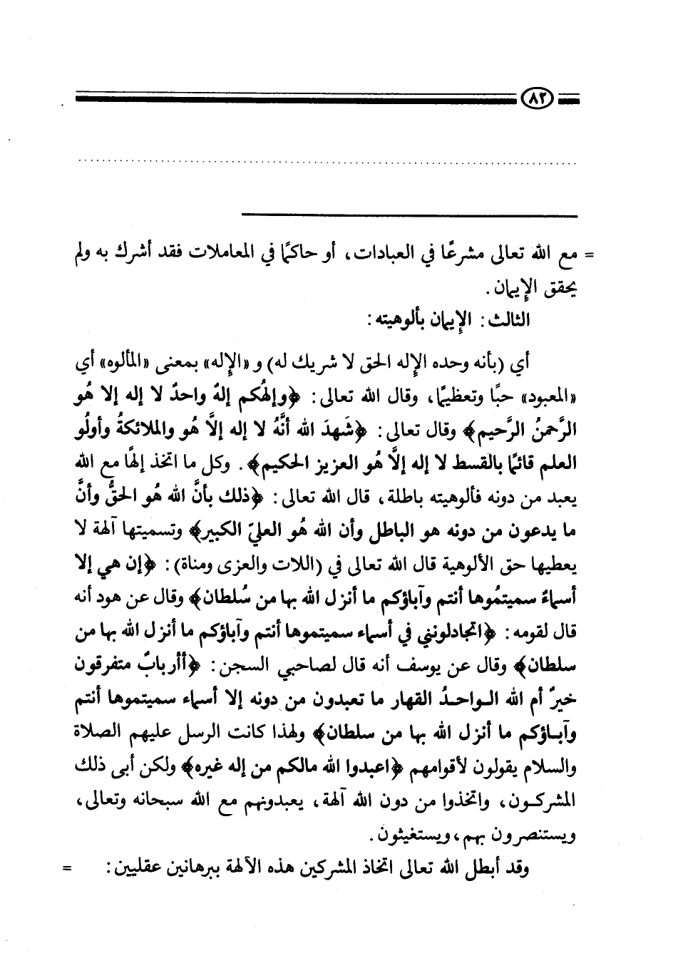 أي (بأنه وحده الإله الحق لا شريك له) و"الإله" بمعنى المألوه" أي "المعبود حبا وتعظيما، وقال الله تعالى: {وَإِلَهُكُمْ إِلَهٌ وَاحِدٌ لَا إِلَهَ إِلَّا هُوَ الرَّحْمَنُ الرَّحِيمُ} وقال تعالى: {شَهِدَ اللَّهُ أَنَّهُ لَا إِلَهَ إِلَّا هُوَ وَالْمَلَائِكَةُ وَأُولُو الْعِلْمِ قَائِمًا بِالْقِسْطِ لَا إِلَهَ إِلَّا هُوَ الْعَزِيزُ الْحَكِيمُ} . وكل ما اتخذ إلها مع الله يعبد من دونه فألوهيته باطلة، قال الله تعالى: {ذَلِكَ بِأَنَّ اللَّهَ هُوَ الْحَقُّ وَأَنَّ مَا يَدْعُونَ مِنْ دُونِهِ هُوَ الْبَاطِلُ وَأَنَّ اللَّهَ هُوَ الْعَلِيُّ الْكَبِيرُ} وتسميتها آلهة لا يعطيها حق الألوهية قال الله تعالى في (اللات والعزى ومناة) : {إِنْ هِيَ إِلَّا أَسْمَاءٌ سَمَّيْتُمُوهَا أَنْتُمْ وَآبَاؤُكُمْ مَا أَنْزَلَ اللَّهُ بِهَا مِنْ سُلْطَانٍ} وحكى عن هود أنه قال لقومه: {أَتُجَادِلُونَنِي فِي أَسْمَاءٍ سَمَّيْتُمُوهَا أَنْتُمْ وَآبَاؤُكُمْ مَا نَزَّلَ اللَّهُ بِهَا مِنْ سُلْطَانٍ} وحكى عن يوسف أنه قال لصاحبي السجن: {أَأَرْبَابٌ مُتَفَرِّقُونَ خَيْرٌ أَمِ اللَّهُ الْوَاحِدُ الْقَهَّارُ مَا تَعْبُدُونَ مِنْ دُونِهِ إِلَّا أَسْمَاءً سَمَّيْتُمُوهَا أَنْتُمْ وَآبَاؤُكُمْ مَا أَنْزَلَ اللَّهُ بِهَا مِنْ سُلْطَانٍ} ولهذا كانت الرسل عليهم الصلاة والسلام يقولون لأقوامهم: {اعْبُدُوا اللَّهَ مَا لَكُمْ مِنْ إِلَهٍ غَيْرُهُ} ولكن أبى ذلك المشركون، واتخذوا من دون الله آلهة، يعبدونهم مع الله سبحانه وتعالى، ويستنصرون بهم، ويستغيثون.