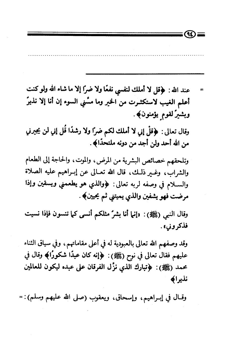 وتلحقهم خصائص البشرية من المرض، والموت، والحاجة إلى الطعام والشراب، وغير ذلك، قال الله تعالى عن إبراهيم عليه الصلاة والسلام في وصفه لربه تعالى: {وَالَّذِي هُوَ يُطْعِمُنِي وَيَسْقِينِ وَإِذَا مَرِضْتُ فَهُوَ يَشْفِينِ وَالَّذِي يُمِيتُنِي ثُمَّ يُحْيِينِ} .