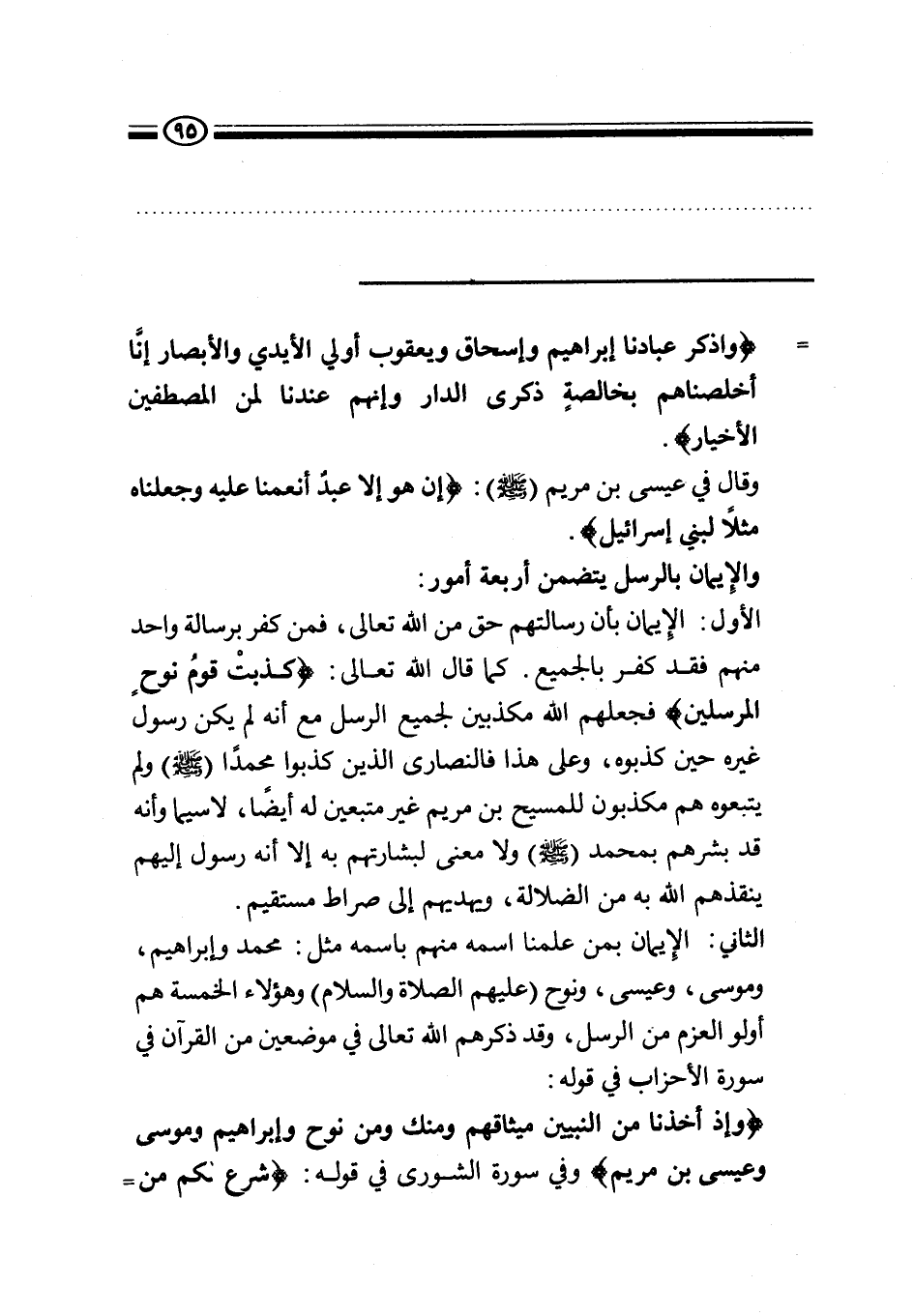 الثاني: الإيمان بمن علمنا اسمه منهم باسمه مثل: محمد وإبراهيم، وموسى، وعيسى ونوح عليهم الصلاة والسلام، وهؤلاء الخمسة هم أولو العزم من الرسل، وقد ذكرهم الله تعالى في موضعين من القرآن: في سورة الأحزاب في قوله: {وَإِذْ أَخَذْنَا مِنَ النَّبِيِّينَ مِيثَاقَهُمْ وَمِنْكَ وَمِنْ نُوحٍ وَإِبْرَاهِيمَ وَمُوسَى وَعِيسَى ابْنِ مَرْيَمَ} . وفي سورة الشورى في قوله: {شَرَعَ لَكُمْ مِنَ الدِّينِ مَا وَصَّى بِهِ نُوحًا وَالَّذِي أَوْحَيْنَا إِلَيْكَ وَمَا وَصَّيْنَا بِهِ إِبْرَاهِيمَ وَمُوسَى وَعِيسَى أَنْ أَقِيمُوا الدِّينَ وَلَا تَتَفَرَّقُوا فِيهِ} .