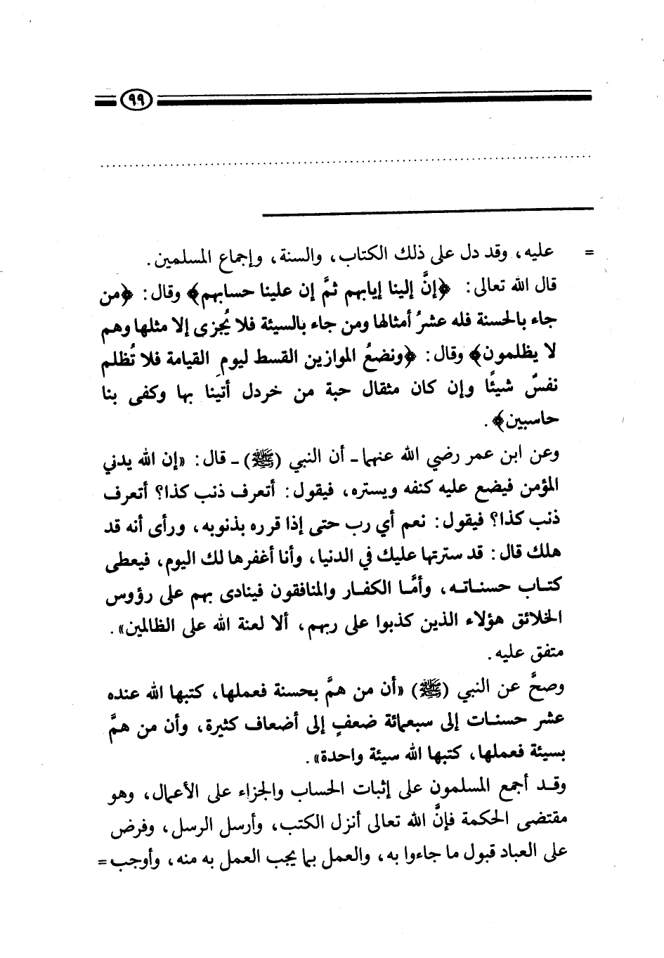 عليه، وقد دل على ذلك الكتاب، والسنة، وإجماع المسلمين، قال الله تعالى: {إِنَّ إِلَيْنَا إِيَابَهُمْ ثُمَّ إِنَّ عَلَيْنَا حِسَابَهُمْ} ، وقال: {مَنْ جَاءَ بِالْحَسَنَةِ فَلَهُ عَشْرُ أَمْثَالِهَا وَمَنْ جَاءَ بِالسَّيِّئَةِ فَلَا يُجْزَى إِلَّا مِثْلَهَا وَهُمْ لَا يُظْلَمُونَ} ، وقال: {وَنَضَعُ الْمَوَازِينَ الْقِسْطَ لِيَوْمِ الْقِيَامَةِ فَلَا تُظْلَمُ نَفْسٌ شَيْئًا وَإِنْ كَانَ مِثْقَالَ حَبَّةٍ مِنْ خَرْدَلٍ أَتَيْنَا بِهَا وَكَفَى بِنَا حَاسِبِينَ} .