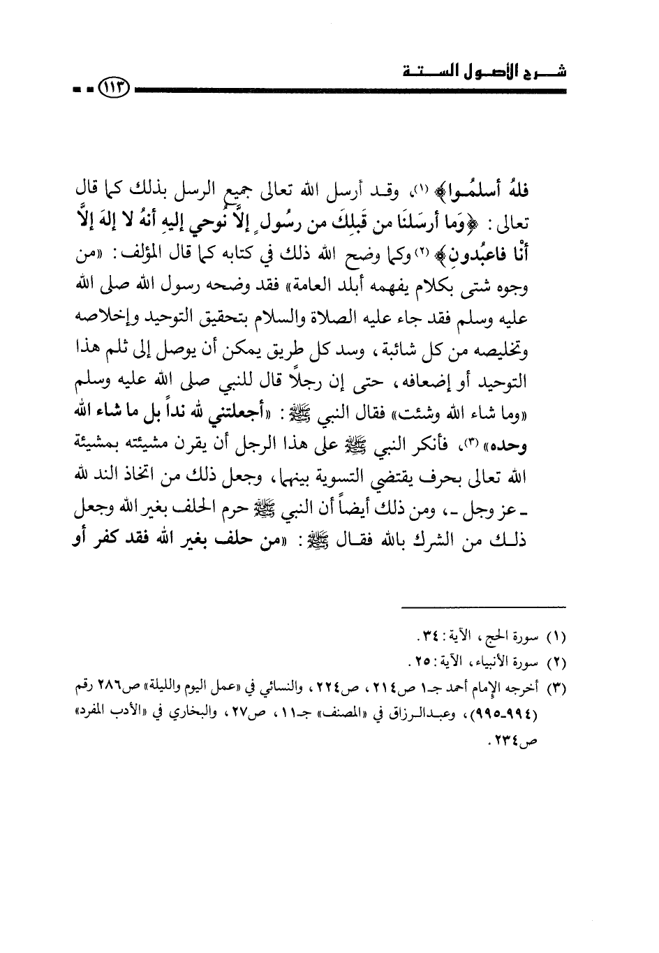 ، وقد أرسل الله تعالى جميع الرسل بذلك كما قال تعالى: {وَمَا أَرْسَلْنَا مِنْ قَبْلِكَ مِنْ رَسُولٍ إِلَّا نُوحِي إِلَيْهِ أَنَّهُ لَا إِلَهَ إِلَّا أَنَا فَاعْبُدُونِ} . وكما وضح الله ذلك في كتابه كما قال المؤلف: "من وجوه شتى بكلام يفهمه أبلد العامة "، فقد وضحه رسول الله - صَلَّى اللَّهُ عَلَيْهِ وَسَلَّمَ - فقد جاء - عليه الصلاة والسلام - بتحقيق التوحيد وإخلاصه وتخليصه من كل شائبة، وسد كل طريق يمكن أن يوصل إلى ثلم هذا التوحيد أو إضعافه، حتى «أن رجلًا قال للنبي صَلَّى اللَّهُ عَلَيْهِ وَسَلَّمَ: "وما شاء الله وشئت" فقال النبي - صَلَّى اللَّهُ عَلَيْهِ وَسَلَّمَ -: "أجعلتني لله ندًا بل ما شاء الله وحده» ، فأنكر النبي - صَلَّى اللَّهُ عَلَيْهِ وَسَلَّمَ - على هذا الرجل أن يقرن مشيئته بمشيئة الله تعالى بحرف يقتضي التسوية بينهما، وجعل ذلك من اتخاذ الند لله عز وجل، ومن ذلك أيضًا أن النبي - صَلَّى اللَّهُ عَلَيْهِ وَسَلَّمَ - حرم الحلف بغير الله وجعل ذلك من الشرك بالله فقال صَلَّى اللَّهُ عَلَيْهِ وَسَلَّمَ: «من حلف بغير الله فقد كفر أو»