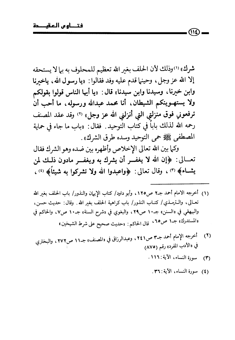«أشرك» ، وذلك لأن الحلف بغير الله تعظيم للمحلوف به بما لا يستحقه إلا الله عز وجل، وحينما «قدم عليه وفد فقالوا: "يا رسول الله، يا خيرنا وابن خيرنا، وسيدنا وابن سيدنا" قال: "يا أيها الناس قولوا بقولكم ولا يستهوينكم الشيطان، أنا محمد عبد الله ورسوله، ما أحب أن ترفعوني فوق منزلتي التي أنزلني الله عز وجل» . وقد عقد المصنف رحمه الله لذلك بابًا في كتاب التوحيد. فقال: "باب ما جاء في حماية المصطفى - صَلَّى اللَّهُ عَلَيْهِ وَسَلَّمَ - حمى التوحيد وسده طرق الشرك ".