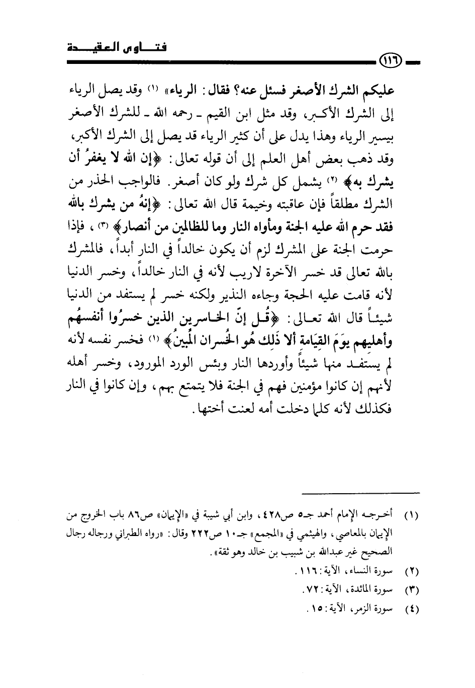 «عليكم الشرك الأصغر فسئل عنه؟ فقال: الرياء» (¬1) . وقد يصل الرياء إلى الشرك الأكبر، وقد مثل ابن القيم رحمه الله للشرك الأصغر بيسير الرياء وهذا يدل على أن كثير الرياء قد يصل إلى الشرك الأكبر، وقد ذهب بعض أهل العلم إلى أن قوله تعالى: {إِنَّ اللَّهَ لَا يَغْفِرُ أَنْ يُشْرَكَ بِهِ} . يشمل كل شرك ولو كان أصغر، فالواجب الحذر من الشرك مطلقًا فإن عاقبته وخيمة قال الله تعالى: {إِنَّهُ مَنْ يُشْرِكْ بِاللَّهِ فَقَدْ حَرَّمَ اللَّهُ عَلَيْهِ الْجَنَّةَ وَمَأْوَاهُ النَّارُ وَمَا لِلظَّالِمِينَ مِنْ أَنْصَارٍ} ،، فإذا حرمت الجنة على المشرك لزم أن يكون خالدًا في النار أبدًا، فالمشرك بالله تعالى قد خسر الآخرة لا ريب لأنه في النار خالدًا، وخسر الدنيا لأنه قامت عليه الحجة وجاءه النذير ولكنه خسر لم يستفد من الدنيا شيئًا قال الله تعالى: {قُلْ إِنَّ الْخَاسِرِينَ الَّذِينَ خَسِرُوا أَنْفُسَهُمْ وَأَهْلِيهِمْ يَوْمَ الْقِيَامَةِ أَلَا ذَلِكَ هُوَ الْخُسْرَانُ الْمُبِينُ} . فخسر نفسه لأنه لم يستفد منها شيئًا وأوردها النار وبئس الورد المورود، وخسر أهله لأنهم إن كانوا مؤمنين فهم في الجنة فلا يتمتع بهم، وإن كانوا في النار فكذلك لأنه كلما دخلت أمة لعنت أختها.