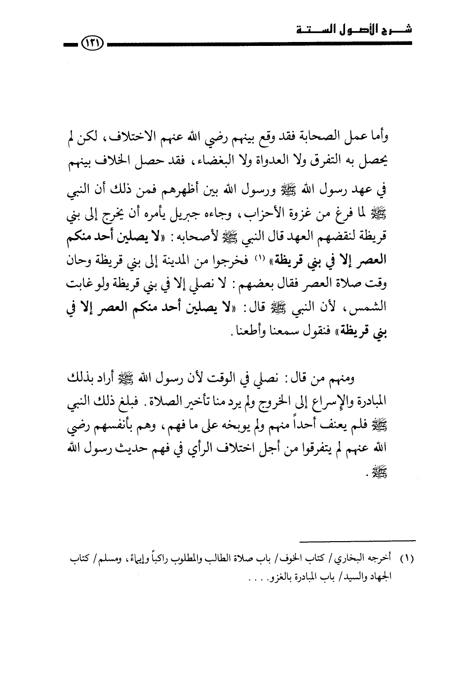 ومنهم من قال: نصلي في الوقت لأن رسول الله - صَلَّى اللَّهُ عَلَيْهِ وَسَلَّمَ - أراد بذلك المبادرة والإسراع إلى الخروج ولم يرد منا تأخير الصلاة. فبلغ ذلك النبي - صَلَّى اللَّهُ عَلَيْهِ وَسَلَّمَ - فلم يعنف أحدًا منهم ولم يوبخه على ما فهم» ، وهم بأنفسهم رضي الله عنهم لم يتفرقوا من أجل اختلاف الرأي في فهم حديث رسول الله - صَلَّى اللَّهُ عَلَيْهِ وَسَلَّمَ -.