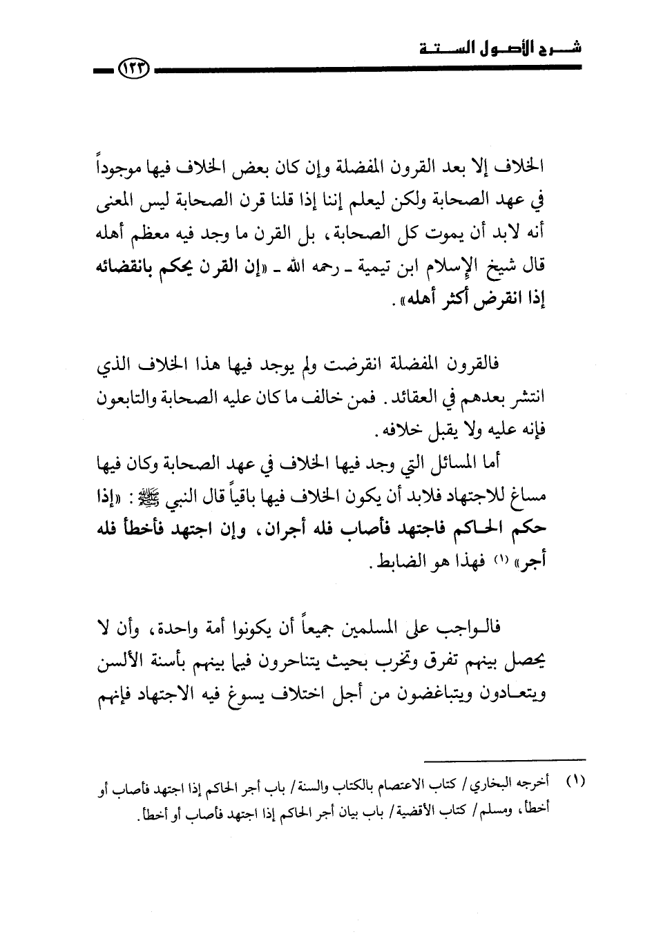 أما المسائل التي وجد فيها الخلاف في عهد الصحابة وكان فيها مساغ للاجتهاد فلا بد أن يكون الخلاف فيها باقيًا قال النبي صَلَّى اللَّهُ عَلَيْهِ وَسَلَّمَ: «إذا حكم الحاكم فاجتهد فأصاب فله أجران، وإن اجتهد فأخطأ فله أجر» فهذا هو الضابط.