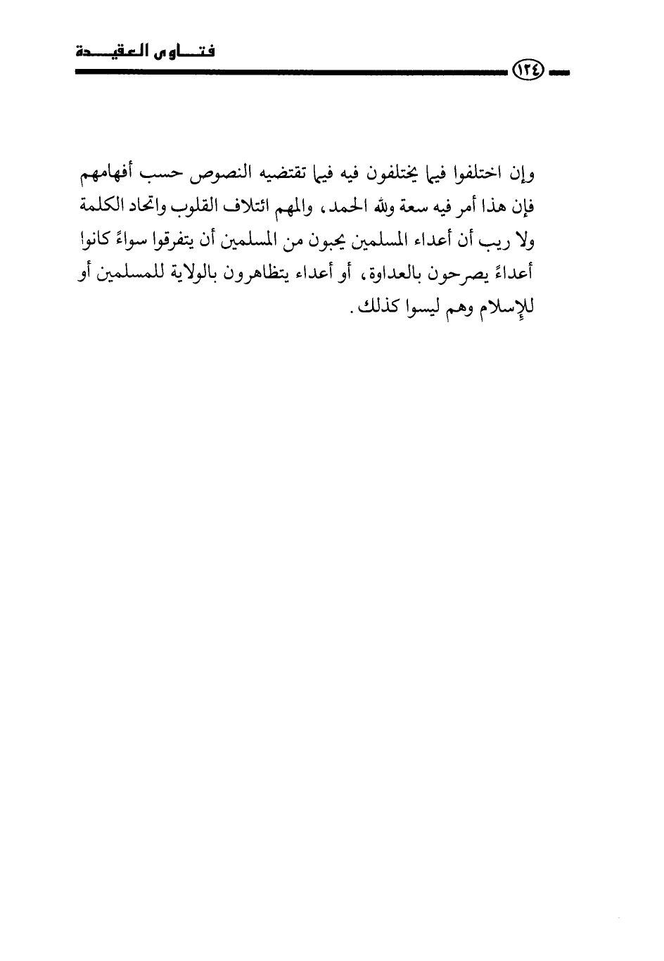 وإن اختلفوا فيما يختلفون فيه فيما تقتضيه النصوص حسب أفهامهم فإن هذا أمر فيه سعة ولله الحمد، والمهم ائتلاف القلوب واتحاد الكلمة ولا ريب أن أعداء المسلمين يحبون من المسلمين أن يتفرقوا سواء كانوا أعداء يصرحون بالعداوة، أو أعداء يتظاهرون بالولاية للمسلمين أو للإسلام وهم ليسوا كذلك.