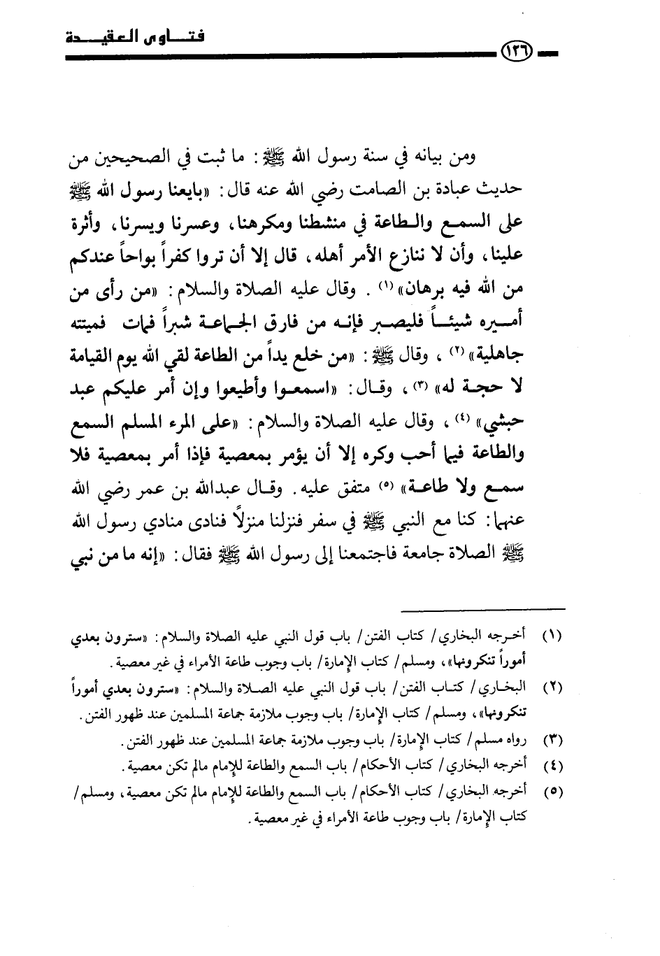 ومن بيانه في سنة رسول الله - صَلَّى اللَّهُ عَلَيْهِ وَسَلَّمَ -: ما ثبت في الصحيحين من حديث عبادة ابن الصامت - رضي الله عنه - قال: «بايعنا رسول الله - صَلَّى اللَّهُ عَلَيْهِ وَسَلَّمَ - على السمع والطاعة في منشطنا ومكرهنا، وعسرنا ويسرنا، وأثرة علينا، وأن لا ننازع الأمر أهله، قال: إلا أن تروا كفرًا بواحًا عندكم من الله فيه برهان» . وقال - عليه الصلاة والسلام -: «من رأى من أميره شيئًا فليصبر فإنه من فارق الجماعة شبرًا فمات فميتته جاهلية» ، وقال - صَلَّى اللَّهُ عَلَيْهِ وَسَلَّمَ -: «من خلع يدًا من الطاعة لقي الله يوم القيامة لا حجة له» ، وقال: «اسمعوا وأطيعوا وإن أمر عليكم عبد حبشي» ، وقال - عليه الصلاة والسلام -: «على المرء المسلم السمع والطاعة فيما أحب وكره إلا أن يؤمر بمعصية فإذا أمر بمعصية فلا سمع ولا طاعة» متفق عليه. وقال عبد الله بن عمر - رضي الله عنهما -: «كنا مع النبي - صَلَّى اللَّهُ عَلَيْهِ وَسَلَّمَ - في سفر فنزلنا منزلًا فنادى منادي رسول الله - صَلَّى اللَّهُ عَلَيْهِ وَسَلَّمَ -: " الصلاة جامعة " فاجتمعنا إلى رسول الله - صَلَّى اللَّهُ عَلَيْهِ وَسَلَّمَ - فقال: "إنه ما من نبي»