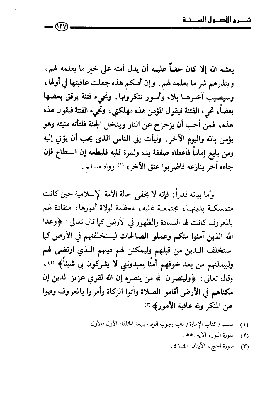 وأما بيانه قدرًا: فإنه لا يخفى حال الأمة الإسلامية حين كانت متمسكة بدينها، مجتمعة عليه، معظمة لولاة أمورها، منقادة لهم بالمعروف، كانت لها السيادة والظهور في الأرض كما قال تعالى: {وَعَدَ اللَّهُ الَّذِينَ آمَنُوا مِنْكُمْ وَعَمِلُوا الصَّالِحَاتِ لَيَسْتَخْلِفَنَّهُمْ فِي الْأَرْضِ كَمَا اسْتَخْلَفَ الَّذِينَ مِنْ قَبْلِهِمْ وَلَيُمَكِّنَنَّ لَهُمْ دِينَهُمُ الَّذِي ارْتَضَى لَهُمْ وَلَيُبَدِّلَنَّهُمْ مِنْ بَعْدِ خَوْفِهِمْ أَمْنًا يَعْبُدُونَنِي لَا يُشْرِكُونَ بِي شَيْئًا} ، وقال تعالى: {وَلَيَنْصُرَنَّ اللَّهُ مَنْ يَنْصُرُهُ إِنَّ اللَّهَ لَقَوِيٌّ عَزِيزٌ الَّذِينَ إِنْ مَكَّنَّاهُمْ فِي الْأَرْضِ أَقَامُوا الصَّلَاةَ وَآتَوُا الزَّكَاةَ وَأَمَرُوا بِالْمَعْرُوفِ وَنَهَوْا عَنِ الْمُنْكَرِ وَلِلَّهِ عَاقِبَةُ الْأُمُورِ} . .