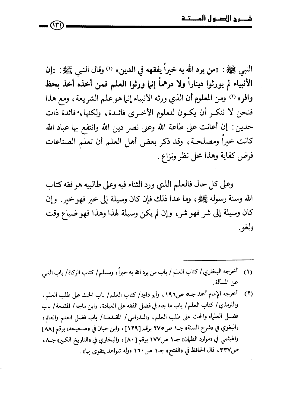 وعلى كل حال فالعلم الذي ورد الثناء فيه وعلى طالبيه هو فقه كتاب الله وسنة رسوله - صَلَّى اللَّهُ عَلَيْهِ وَسَلَّمَ -، وما عدا ذلك فإن كان وسيلة إلى خير فهو خير، وإن كان وسيلة إلى شر فهو شر، وإن لم يكن وسيلة لهذا وهذا فهو ضياع وقت ولغو.