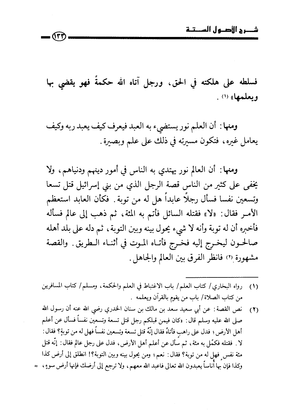 ومنها: أن العالم نور يهتدي به الناس في أمور دينهم ودنياهم، ولا يخفى على كثير من الناس «قصة الرجل من بني إسرائيل الذي قتل تسعًا وتسعين نفسًا فسأل رجلًا عابدًا هل له من توبة. فكأن العابد استعظم الأمر فقال: "لا" فقتله السائل فأتم به المائة، ثم ذهب إلى عالم فسأله فأخبره أن له توبة وأنه لا شيء يحول بينه وبين التوبة، ثم دله على بلد أهله صالحون ليخرج إليه فخرج فأتاه الموت في أثناء الطريق» ، والقصة مشهورة (¬1) فانظر الفرق بين العالم والجاهل.