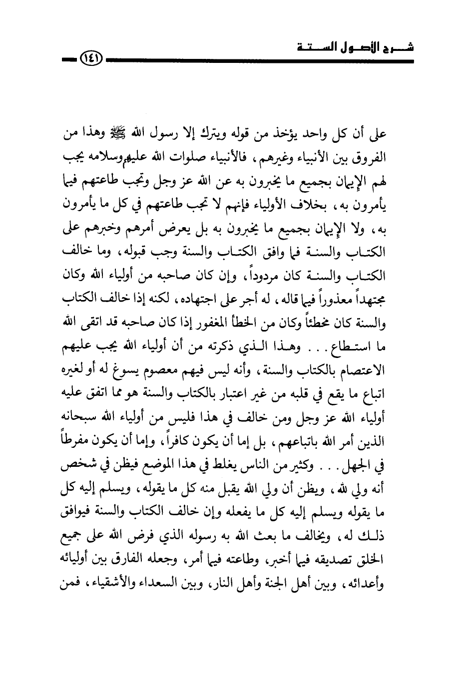وهذا الذي ذكرته من أن أولياء الله يجب عليهم الاعتصام بالكتاب والسنة وأنه ليس فيهم معصوم يسوغ له أو لغيره اتباع ما يقع في قلبه من غير اعتبار بالكتاب والسنة هو مما اتفق عليه أولياء الله عز وجل ومن خالف في هذا فليس من أولياء الله سبحانه الذين أمر الله باتباعهم، بل إما أن يكون كافرًا، وإما أن يكون مفرطًا في الجهل. . . . وكثير من الناس يغلط في هذا الموضع فيظن في شخص أنه ولي لله، ويظن أن ولي الله يقبل منه كل ما يقوله، ويسلم إليه كل ما يقوله ويسلم إليه كل ما يفعله وإن خالف الكتاب والسنة فيوافق ذلك له، ويخالف ما بعث الله به رسوله الذي فرض الله على جميع الخلق تصديقه فيما أخبر، وطاعته فيما أمر، وجعله الفارق بين أوليائه وأعدائه، وبين أهل الجنة وأهل النار، وبين السعداء والأشقياء، فمن