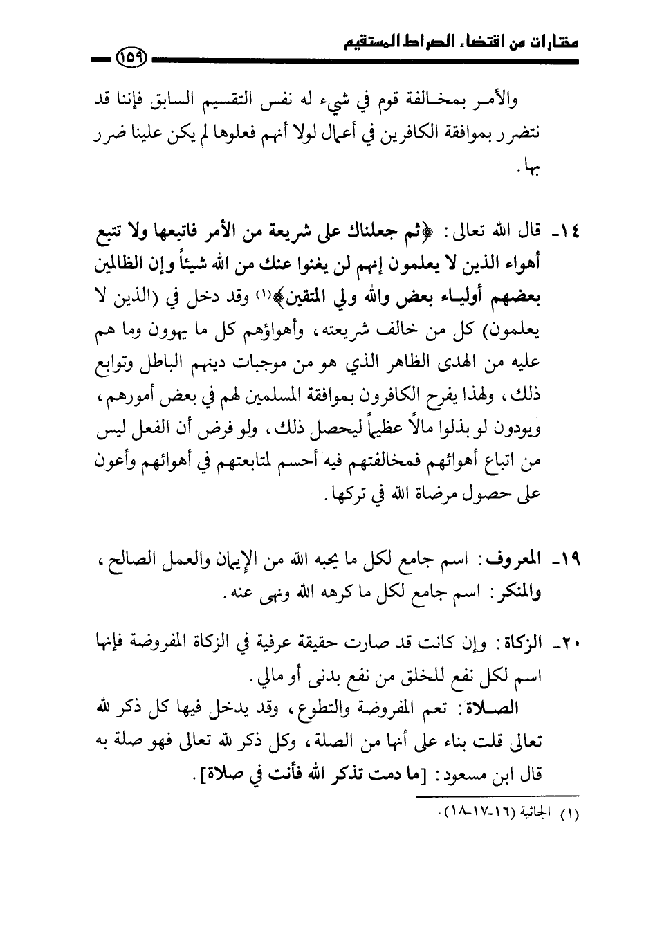 14 -قال الله تعالى: {ثُمَّ جَعَلْنَاكَ عَلَى شَرِيعَةٍ مِنَ الْأَمْرِ فَاتَّبِعْهَا وَلَا تَتَّبِعْ أَهْوَاءَ الَّذِينَ لَا يَعْلَمُونَ إِنَّهُمْ لَنْ يُغْنُوا عَنْكَ مِنَ اللَّهِ شَيْئًا وَإِنَّ الظَّالِمِينَ بَعْضُهُمْ أَوْلِيَاءُ بَعْضٍ وَاللَّهُ وَلِيُّ الْمُتَّقِينَ} ، وقد دخل في (الذين لا يعلمون) كل من خالف شريعته، وأهواؤهم كل ما يهوون وما هم عليه من الهدى الظاهر الذي هو من موجبات دينهم الباطل وتوابع ذلك، ولهذا يفرح الكافرون بموافقة المسلمين لهم في بعض أمورهم، ويودون لو بذلوا مالًا عظيمًا ليحصل ذلك، ولو فرض أن الفعل ليس من اتباع أهوائهم فمخالفتهم فيه أحسم لمتابعتهم في أهوائهم وأعون على حصول مرضاة الله في تركها.