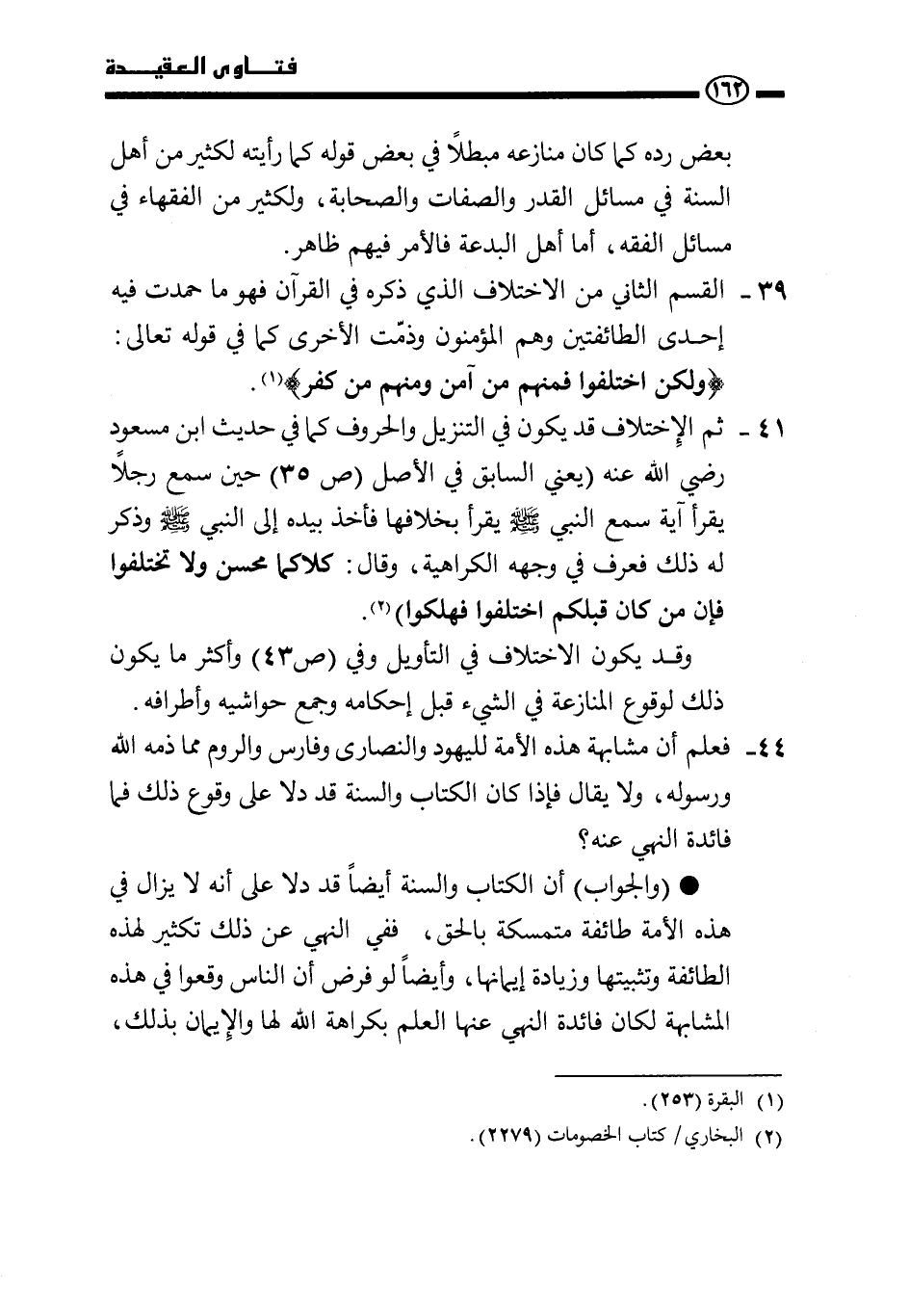 39 - القسم الثاني من الاختلاف الذي ذكره في القرآن فهو ما حمدت فيه إحدى الطائفتين وهم المؤمنون وذمت الأخرى كما في قوله تعالى: {وَلَكِنِ اخْتَلَفُوا فَمِنْهُمْ مَنْ آمَنَ وَمِنْهُمْ مَنْ كَفَرَ} .
