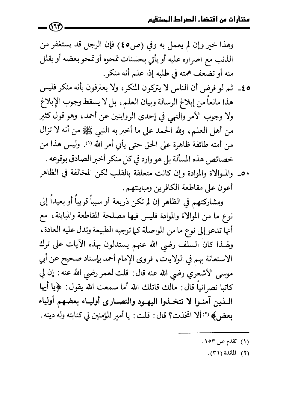 ومشاركتهم في الظاهر إن لم تكن ذريعة أو سببًا قريبًا أو بعيدًا إلى نوع ما من الموالاة والموادة فليس فيها مصلحة المقاطعة والمباينة، مع أنها تدعو إلى نوع ما من المواصلة كما توجبه الطبيعة وتدل عليه العادة، ولهذا كان السلف رضي الله عنهم يستدلون بهذه الآيات على ترك الاستعانة بهم في الولايات، فروى الإمام أحمد بإسناد صحيح عن أبي موسى الأشعري - رضي الله عنه - قال: قلت لعمر رضي الله عنه: إن لي كاتبًا نصرانيًا قال: مالك قاتلك الله أما سمعت الله يقول: {يَا أَيُّهَا الَّذِينَ آمَنُوا لَا تَتَّخِذُوا الْيَهُودَ وَالنَّصَارَى أَوْلِيَاءَ بَعْضُهُمْ أَوْلِيَاءُ بَعْضٍ} ، ألا اتخذت؟ قال: قلت: يا أمير المؤمنين لي كتابته وله دينه.