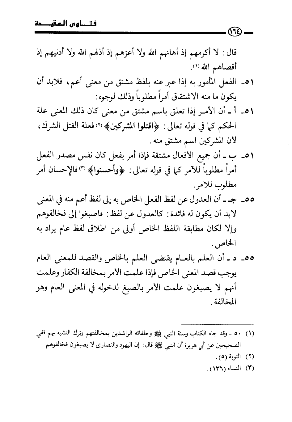55 -ج - أن العدول عن لفظ الفعل الخاص به إلى لفظ أعم منه في المعنى لا بد أن يكون له فائدة: كالعدول عن لفظ: فاصبغوا إلى فخالفوهم وإلا لكان مطابقة اللفظ الخاص أولى من إطلاق لفظ عام يراد به الخاص.