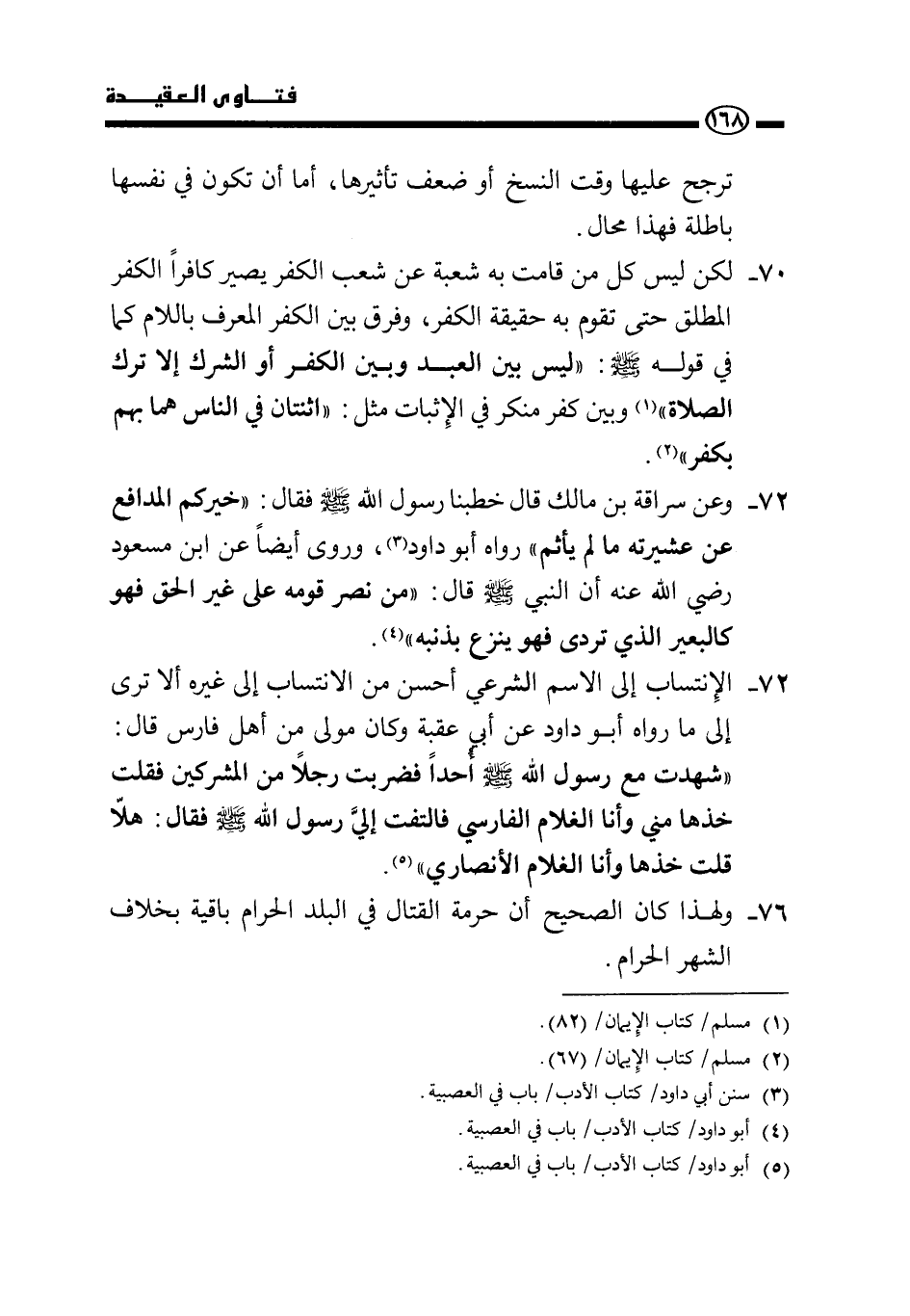 72 - الانتساب إلى الاسم الشرعي أحسن من الانتساب إلى غيره ألا ترى إلى ما رواه أبو داود عن أبي عقبة وكان مولى من أهل فارس قال: «شهدت مع رسول الله - صَلَّى اللَّهُ عَلَيْهِ وَسَلَّمَ - أحدًا فضربت رجلًا من المشركين فقلت: خذها مني وأنا الغلام الفارسي فالتفت إلي رسول الله - صَلَّى اللَّهُ عَلَيْهِ وَسَلَّمَ - فقال: هلا قلت: خذها وأنا الغلام الأنصاري» .