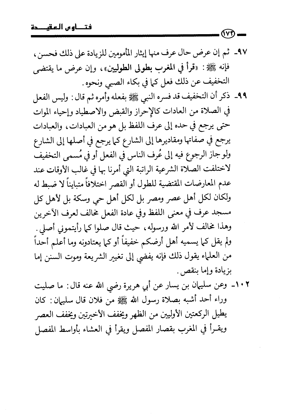 99 - ذكر أن التخفيف قد فسره النبي - صَلَّى اللَّهُ عَلَيْهِ وَسَلَّمَ - بفعله وأمره ثم قال: وليس الفعل في الصلاة من العادات كالإحراز والقبض والاصطياد وإحياء الموات حتى يرجع في حده إلى عرف اللفظ بل هو من العبادات، والعبادات يرجع في صفاتها ومقاديرها إلى الشارع كما يرجع في أصلها إلى الشارع ولو جاز الرجوع فيه إلى عرف الناس في الفعل أو في مسمى التخفيف لاختلفت الصلاة الشرعية الراتبة التي أمرنا بها في غالب الأوقات عند عدم المعارضات المقتضية للطول أو القصر اختلافًا متباينًا لا ضبط له, ولكان لكل أهل عصر ومصر بل لكل أهل حي وسكة بل لأهل كل مسجد عرف في معنى اللفظ وفي عادة الفعل مخالف لعرف الآخرين وهذا مخالف لأمر الله ورسوله، حيث قال: «صلوا كما رأيتموني أصلي» .