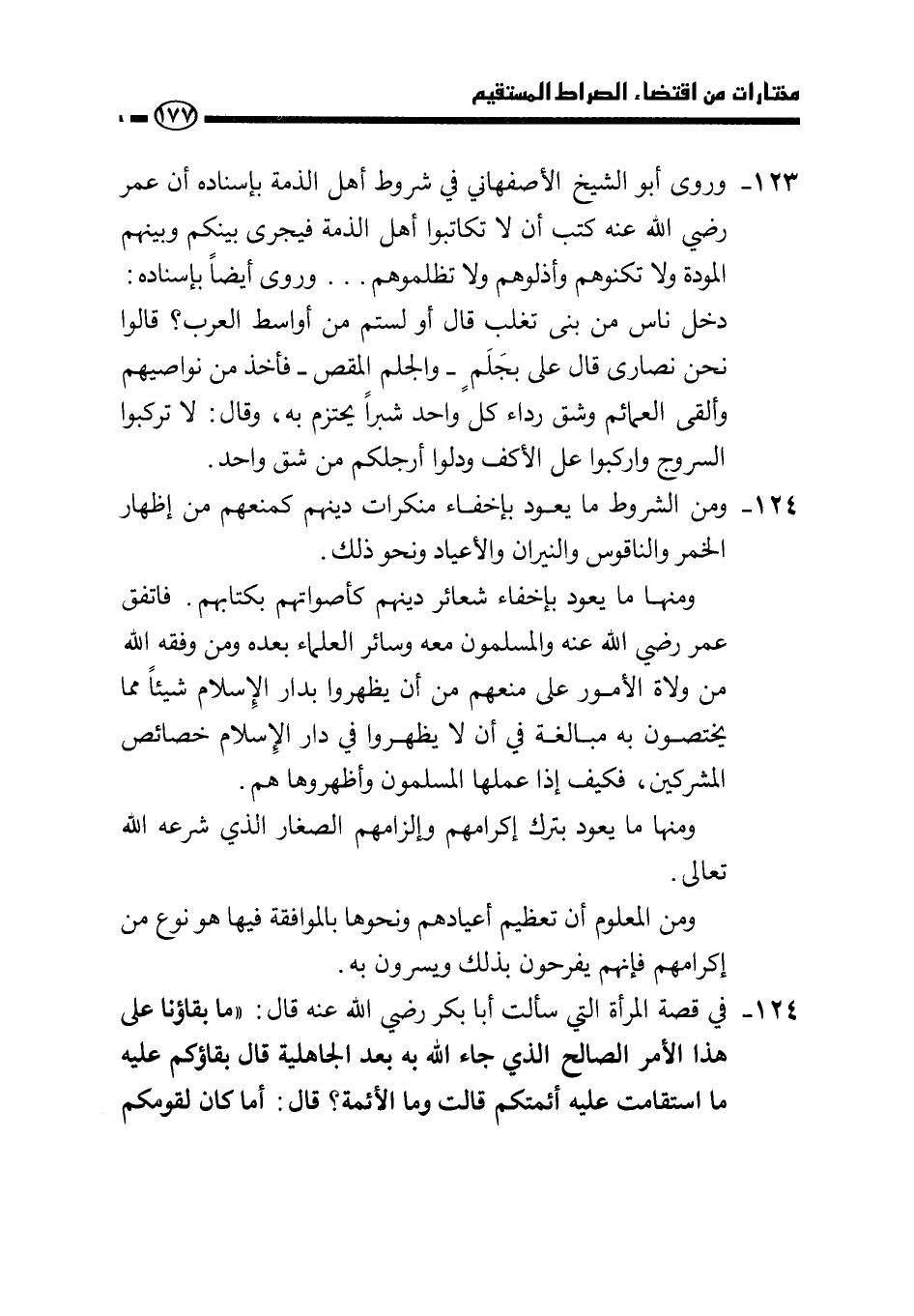 123 - وروى أبو الشيخ الأصفهاني في شروط أهل الذمة بإسناده أن عمر - رضي الله عنه - كتب: (أن لا تكاتبوا أهل الذمة فيجري بينكم وبينهم المودة ولا تكنوهم وأذلوهم ولا تظلموهم..) . وروى أيضًا بإسناده: دخل ناس من بني تغلب قال: " أو لستم من أواسط العرب؟ قالوا: نحن نصارى قال: علي بجلم - والجلم المقص - فأخذ من نواصيهم وألقى العمائم وشق رداء كل واحد شبرًا يحتزم به، وقال: لا تركبوا السروج واركبوا على الأكف ودلوا أرجلكم من شق واحد.