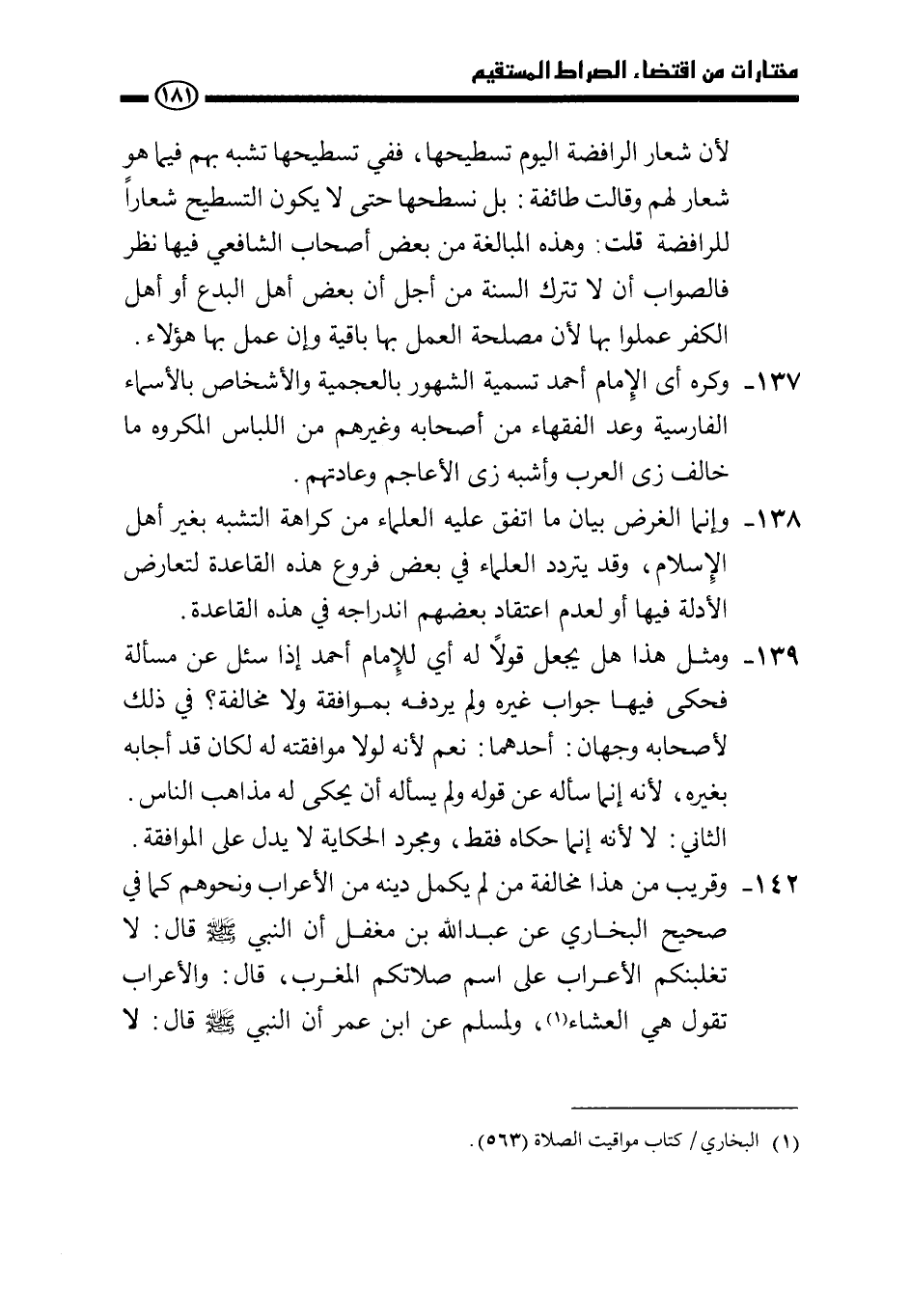 137 - وكره أي الإمام أحمد تسمية الشهور بالعجمية والأشخاص بالأسماء الفارسية وعد الفقهاء من أصحابه وغيرهم من اللباس المكروه ما خالف زي العرب وأشبه زي الأعاجم وعادتهم.