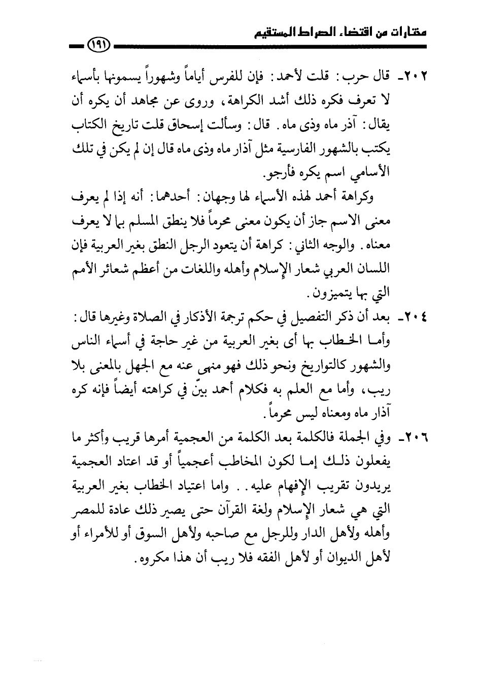 204 - بعد أن ذكر التفصيل في حكم ترجمة الأذكار في الصلاة وغيرها قال: وأما الخطاب بها أي بغير العربية من غير حاجة في أسماء الناس والشهور كالتواريخ ونحو ذلك فهو منهي عنه مع الجهل بالمعنى بلا ريب، وأما مع العلم به فكلام أحمد بين في كراهته أيضا فإنه كره آذار ماه ومعناه ليس محرما.