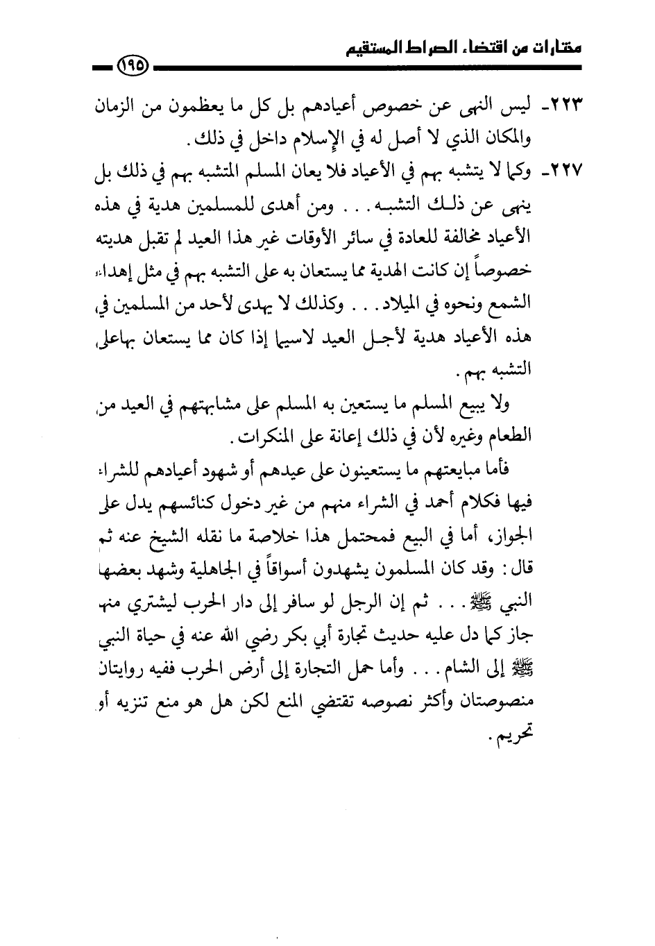 227 - وكما لا يتشبه بهم في الأعياد فلا يعان المسلم المتشبه بهم في ذلك بل يُنهى عن ذلك التشبه.. ومن أهدى للمسلمين هدية في هذه الأعياد مخالفة للعادة في سائر الأوقات غير هذا العيد لم تقبل هديته خصوصا إن كانت الهدية مما يستعان به على التشبه بهم في مثل إهداء الشمع ونحوه في الميلاد.. وكذلك لا يُهدى لأحد من المسلمين في هذه الأعياد هدية لأجل العيد لا سيما إذا كان مما يستعان بها على التشبه بهم.