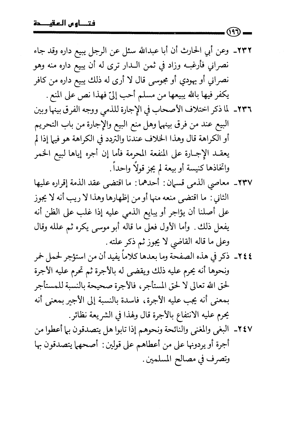 236- لما ذكر اختلاف الأصحاب في الإجارة للذمي ووجه الفرق بينها وبين البيع عند من فرق بينهما وهل منع البيع والإجارة من باب التحريم أو الكراهة قال: وهذا الخلاف عندنا والتردد في الكراهة هو فيما إذا لم يعقد الإجارة على المنفعة المحرمة فأما إن أجره إياها لبيع الخمر واتخاذها كنيسة أو بيعة لم يجز قولا واحدا.