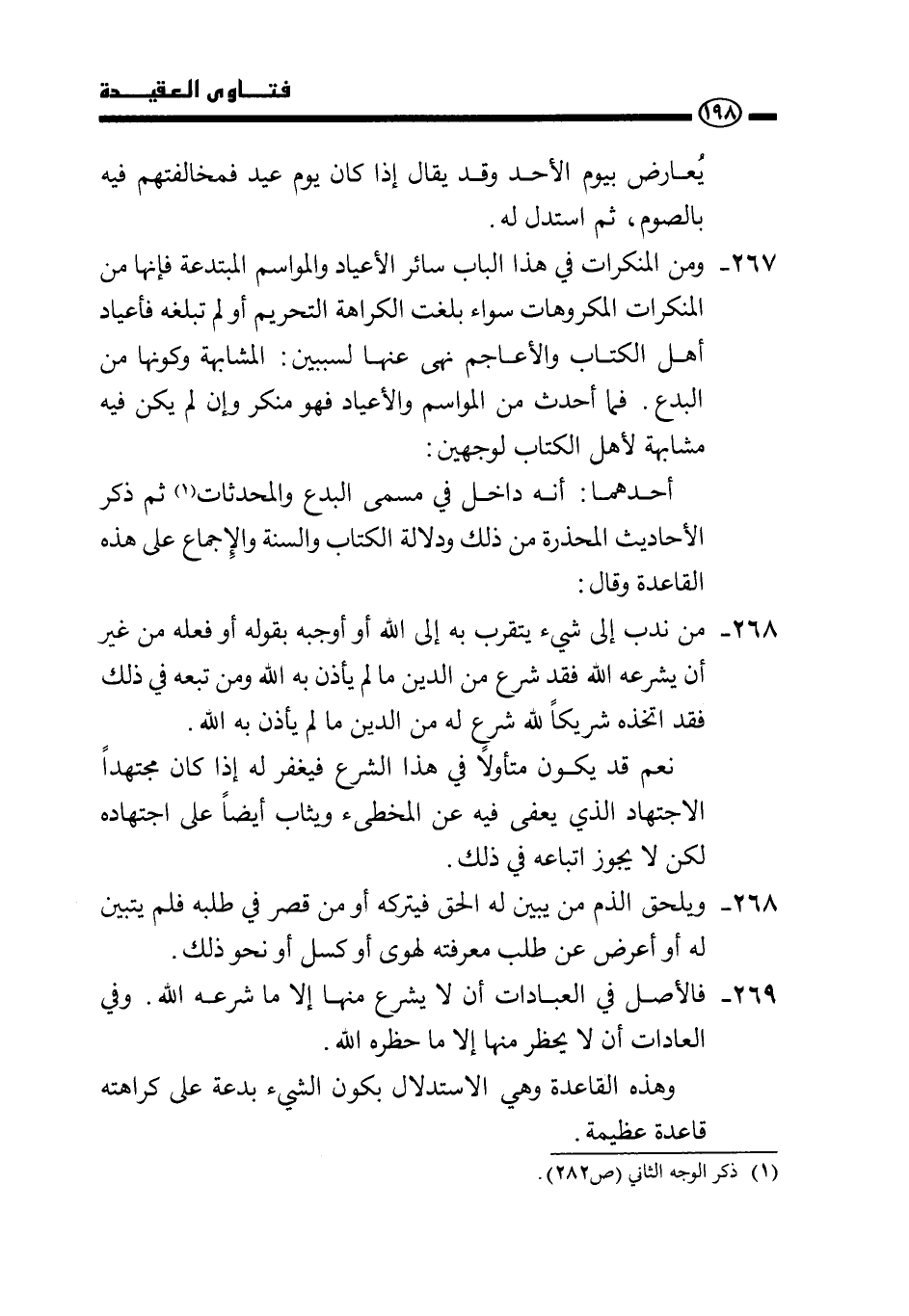 267 - ومن المنكرات في هذا الباب سائر الأعياد والمواسم المبتدعة فإنها من المنكرات المكروهات سواء بلغت الكراهة التحريم أو لم تبلغه فأعياد أهل الكتاب والأعاجم نهي عنها لسببين: المشابهة وكونها من البدع. فما أحدث من المواسم والأعياد فهو منكر وإن لم يكن فيه مشابهة لأهل الكتاب لوجهين: