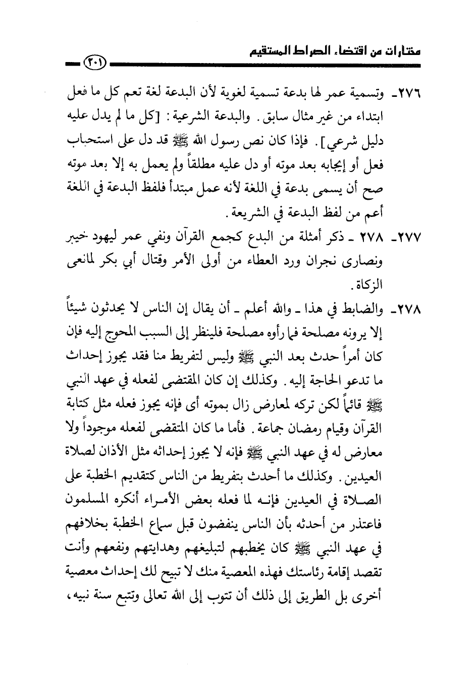 277 - 278- ذكر أمثلة من البدع كجمع القرآن ونفي عمر ليهود خيبر ونصارى نجران ورد العطاء من أولي الأمر وقتال أبي بكر لمانعي الزكاة.