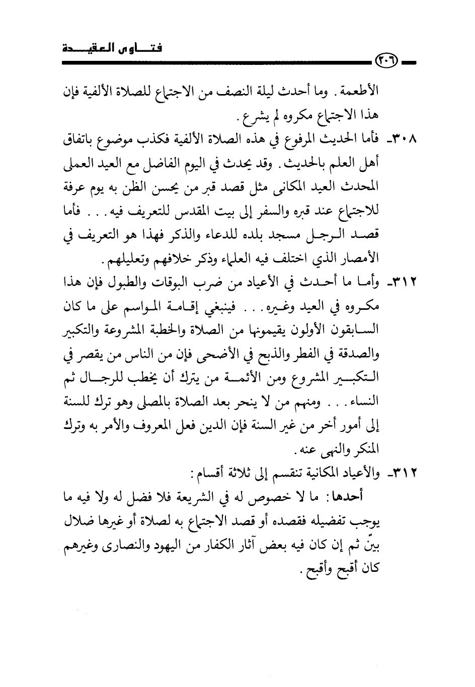 308 - فأما الحديث المرفوع في هذه الصلاة الألفية فكذب موضوع باتفاق أهل العلم بالحديث. وقد يحدث في اليوم الفاضل مع العيد العملي المحدث العيد المكاني مثل قصد قبر من يحسن الظن به يوم عرفة للاجتماع عند قبره والسفر إلى بيت المقدس للتعريف فيه.. فأما قصد الرجل مسجد بلده للدعاء والذكر فهذا هو التعريف في الأمصار الذي اختلف فيه العلماء وذكر خلافهم وتعليلهم.