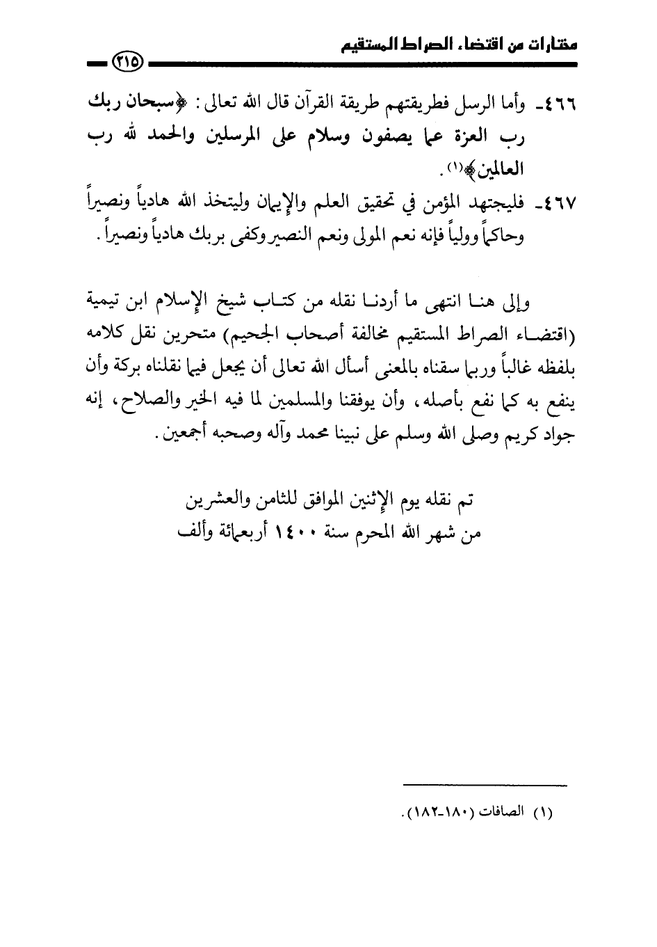 وإلى هنا انتهى ما أردنا نقله من كتاب شيخ الإسلام ابن تيمية (اقتضاء الصراط المستقيم مخالفة أصحاب الجحيم) متحرين نقل كلامه بلفظه غالبا وربما سقناه بالمعنى أسأل الله- تعالى- أن يجعل فيما نقلناه بركة وأن ينفع به كما نفع بأصله، وأن يوفقنا والمسلمين لما فيه الخير والصلاح، إنه جواد كريم وصلى الله وسلم على نبينا محمد وآله وصحبه أجمعين.