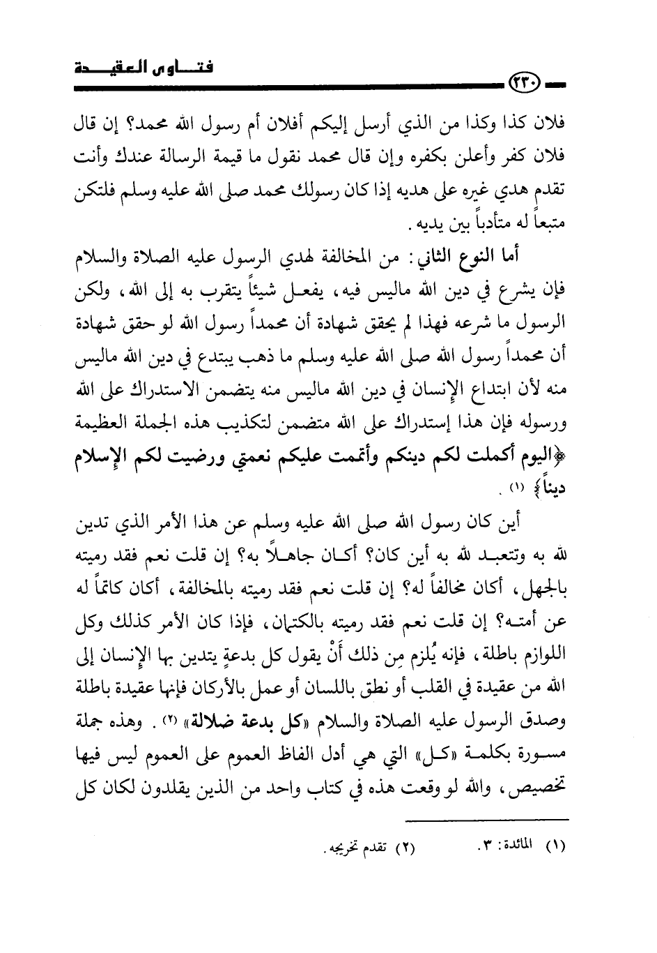 أين كان رسول الله- صَلَّى اللَّهُ عَلَيْهِ وَسَلَّمَ- عن هذا الأمر الذي تدين لله به وتتعبد لله به أين كان؟ أكان جاهلا به؟ إن قلت: نعم فقد رميته بالجهل، أكان مخالفا له؟ إن قلت: نعم فقد رميته بالمخالفة أكان كاتما له عن أمته؟ إن قلت: نعم فقد رميته بالكتمان، فإذا كان الأمر كذلك وكل اللوازم باطلة، فإنه يلزم من ذلك أن يقول: كل بدعة يتدين بها الإنسان إلى الله من عقيدة في القلب أو نطق باللسان أو عمل بالأركان فإنها عقيدة باطلة وصدق الرسول- عليه الصلاة والسلام- «كل بدعة ضلالة» . وهذه جملة مسورة بكلمة "كل" التي هي أدل ألفاظ العموم على العموم ليس فيها تخصيص، والله لو وقعت هذه في كتاب واحد من الذين يقلدون لكان كل