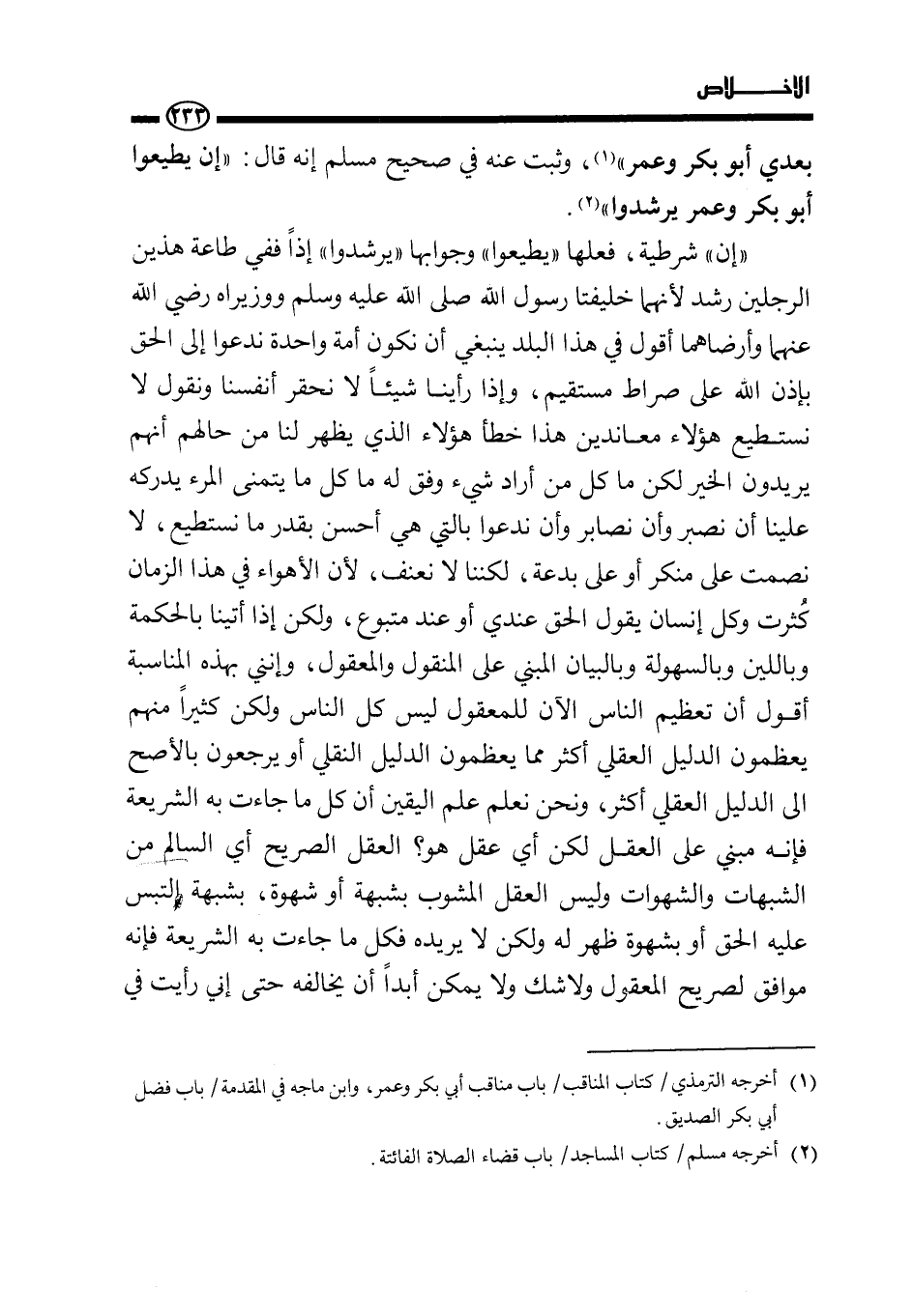 " إن " شرطية، فعلها " يطيعوا " وجوابها " يرشدوا " إذا ففي طاعة هذين الرجلين رشد لأنهما خليفتا رسول الله- صَلَّى اللَّهُ عَلَيْهِ وَسَلَّمَ- ووزيراه رضي الله عنهما وأرضاهما أقول: في هذا البلد ينبغي أن نكون أمة واحدة ندعو إلى الحق بإذن الله على صراط مستقيم، وإذا رأينا شيئا لا نحقر أنفسنا ونقول: لا نستطيع هؤلاء معاندون هذا خطأ هؤلاء الذي يظهر لنا من حالهم أنهم يريدون الخير لكن ما كل من أراد شيئا وفق له ما كل ما يتمنى المرء يدركه علينا أن نصبر وأن نصابر وأن ندعو بالتي هي أحسن بقدر ما نستطيع، لا نصمت على منكر أو على بدعة، لكننا لا نعنف، لأن الأهواء في هذا الزمان كثرت وكل إنسان يقول: الحق عندي أو عند متبوعي، ولكن إذا أتينا بالحكمة وباللين وبالسهولة وبالبيان المبني على المنقول والمعقول. وإنني بهذه المناسبة أقول: إن تعظيم الناس الآن للمعقول ليس كل الناس ولكن كثيرا منهم يعظمون الدليل العقلي أكثر مما يعظمون الدليل النقلي أو يرجعون بالأصح إلى الدليل العقلي أكثر، ونحن نعلم علم اليقين أن كل ما جاءت به الشريعة فإنه مبني على العقل لكن أي عقل هو؟ العقل الصريح أي السالم من الشبهات والشهوات وليس العقل المشوب بشبهة أو شهوة، بشبهة التبس عليه الحق أو بشهوة ظهرت له ولكن لا يريده فكل ما جاءت به الشريعة فإنه موافق لصريح المعقول ولا شك ولا يمكن أبدا أن يخالفه حتى إني رأيت في
