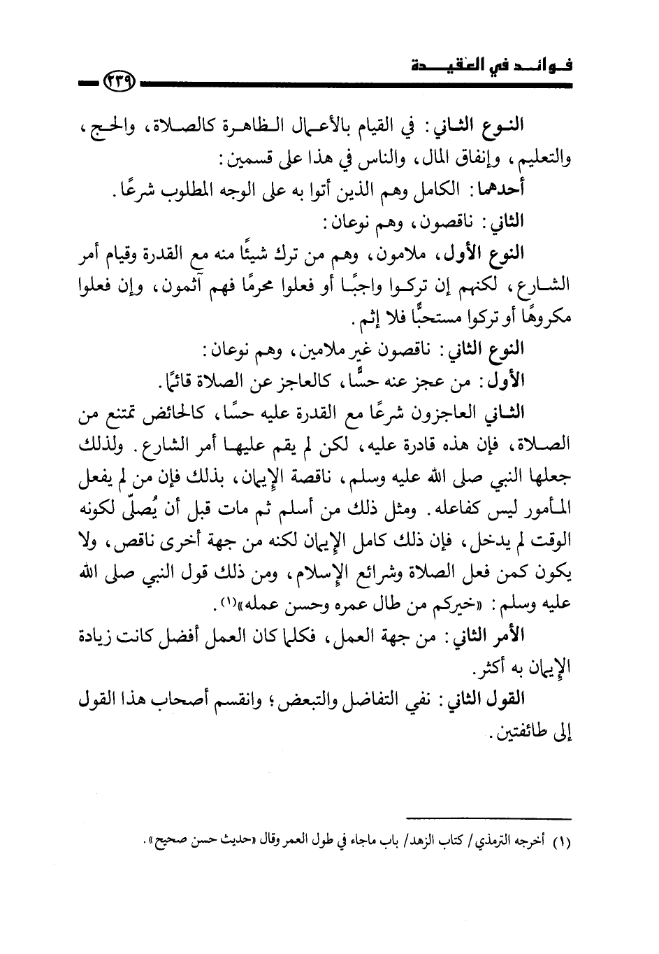 الثاني: العاجزون شرعا مع القدرة عليه حسا. كالحائض تمتنع من الصلاة، فإن هذه قادرة عليه، لكن لم يقم عليها أمر الشارع. ولذلك جعلها النبي صَلَّى اللَّهُ عَلَيْهِ وَسَلَّمَ، ناقصة الإيمان بذلك فإن من لم يفعل المأمور ليس كفاعله. ومثل ذلك من أسلم ثم مات قبل أن يصلي لكون الوقت لم يدخل، فإن ذلك كامل الإيمان لكنه من جهة أخرى ناقص، ولا يكون كمن فعل الصلاة وشرائع الإسلام، ومن ذلك قول النبي صَلَّى اللَّهُ عَلَيْهِ وَسَلَّمَ: «خيركم من طال عمره وحسن عمله» . (¬1)