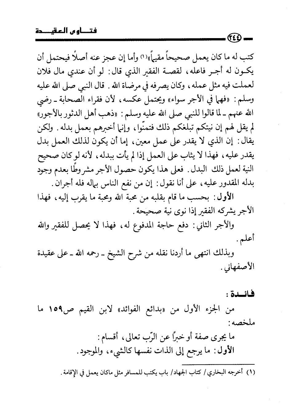 «كتب له ما كان يعمل صحيحا مقيما» (¬1) وأما إن عجز عنه أصلا فيحتمل أن يكون له أجر فاعله، لقصة الفقير الذي قال: لو أن عندي مال فلان لعملت فيه مثل عمله، وكان يصرفه في مرضاة الله. قال النبي صَلَّى اللَّهُ عَلَيْهِ وَسَلَّمَ: «فهما في الأجر سواء» ويحتمل عكسه، لأن «فقراء الصحابة رضي الله عنهم لما قالوا للنبي صَلَّى اللَّهُ عَلَيْهِ وَسَلَّمَ: " ذهب أهل الدثور بالأجور» لم يقل لهم: إن نيتكم تبلغكم ذلك فتمنوا، وإنما أخبرهم بعمل بدله، ولكن يقال: إن الذي لا يقدر على عمل معين، إما أن يكون لذلك العمل بدل يقدر عليه، فهذا لا يثاب على العمل إذا لم يأت ببدله؛ لأنه لو كان صحيح النية لعمل ذلك البدل. فعلى هذا يكون حصول الأجر مشروطا بعدم وجود بدله المقدور عليه، على أنا نقول: إن من نفع الناس بماله فله أجران.