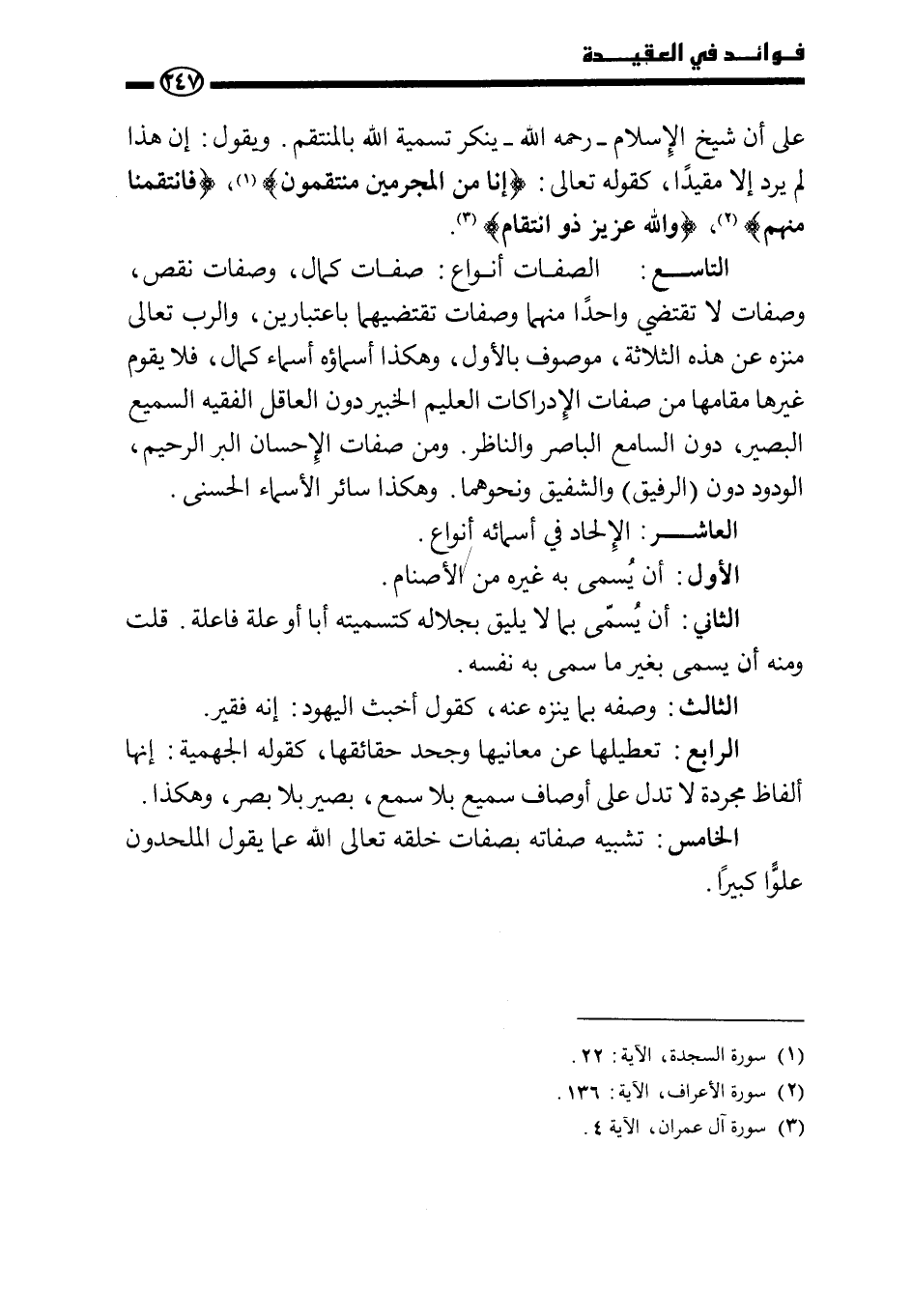 على أن شيخ الإسلام رحمه الله ينكر تسمية الله بالمنتقم. ويقول: إن هذا لم يرد إلا مقيدا، كقوله تعالى: {إِنَّا مِنَ الْمُجْرِمِينَ مُنْتَقِمُونَ} ، {فَانْتَقَمْنَا مِنْهُمْ} ، {وَاللَّهُ عَزِيزٌ ذُو انْتِقَامٍ} .