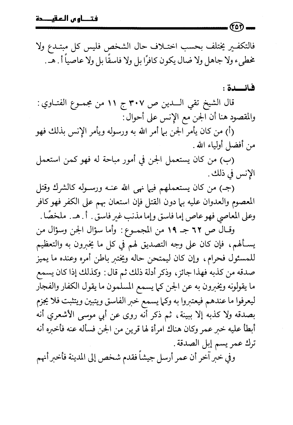 وقال ص 62 ج 19 من المجموع: وأما سؤال الجن وسؤال من يسألهم، فإن كان على وجه التصديق لهم في كل ما يخبرون به والتعظيم للمسؤول فحرام، وإن كان ليمتحن حاله ويختبر باطن أمره وعنده ما يميز صدقه من كذبه فهذا جائز، وذكر أدلة ذلك ثم قال: وكذلك إذا كان يسمع ما يقولونه ويخبرون به عن الجن كما يسمع المسلمون ما يقول الكفار والفجار ليعرفوا ما عندهم فيعتبروا به وكما يسمع خبر الفاسق ويتبين ويتثبت فلا يجزم بصدقه ولا كذبه إلا ببينة، ثم ذكر أنه روي عن أبي موسى الأشعري أنه أبطأ عليه خبر عمر وكان هناك امرأة لها قرين من الجن فسأله عنه فأخبره أنه ترك عمر يسم إبل الصدقة.