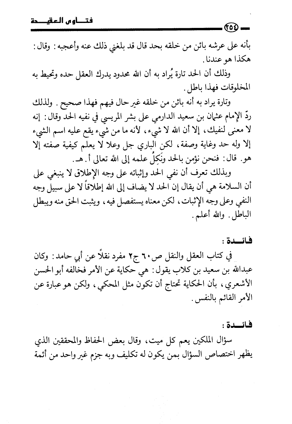 وتارة يراد به أنه بائن من خلقه غير حال فيهم فهذا صحيح. ولذلك رد الإمام عثمان بن سعيد الدارمي على بشر المريسي في نفيه الحد وقال: إنه لا معنى لنفيك، إلا أن الله لا شيء، لأنه ما من شيء يقع عليه اسم الشيء إلا وله حد وغاية وصفة، لكن الباري جل وعلا لا يعلم كيفية صفته إلا هو قال: فنحن نؤمن بالحد ونكل علمه إلى الله- تعالى- ا. هـ.