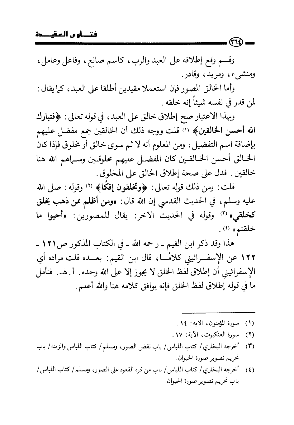 وبهذا الاعتبار صح إطلاق خالق على العبد، في قوله تعالى: {فَتَبَارَكَ اللَّهُ أَحْسَنُ الْخَالِقِينَ} قلت: ووجه ذلك أن الخالقين جمع مفضل عليهم بإضافة اسم التفضيل، ومن المعلوم أنه لا ثم سوى خالق أو مخلوق فإذا كان الخالق أحسن الخالقين كان المفضل عليهم مخلوقين وسماهم الله هنا خالقين. فدل على صحة إطلاق الخالق على المخلوق.