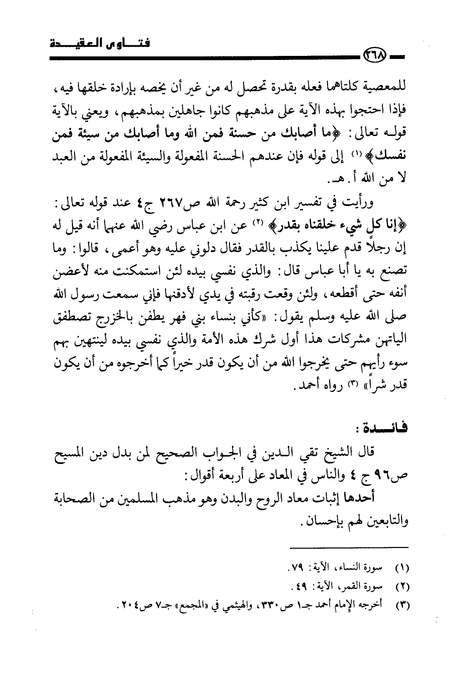 قال الشيخ تقي الدين في الجواب الصحيح لمن بدل دين المسيح ص 96 ج 4: والناس في المعاد على أربعة أقوال: