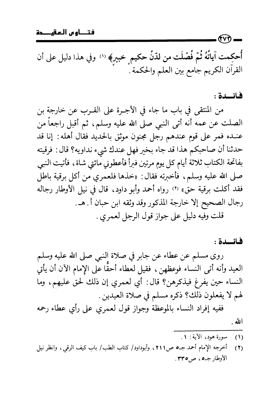 من المنتقى في باب ما جاء في الأجرة على القرب «عن خارجة بن الصلت عن عمه أنه أتى النبي صَلَّى اللَّهُ عَلَيْهِ وَسَلَّمَ، ثم أقبل راجعا من عنده فمر على قوم عندهم رجل مجنون موثق بالحديد فقال أهله: إنا قد حدثنا أن صاحبكم هذا قد جاء بخير فهل عندك شيء نداويه؟ قال: فرقيته بفاتحة الكتاب ثلاثة أيام كل يوم مرتين فبرأ فأعطوني مائتي شاة، فأتيت النبي صَلَّى اللَّهُ عَلَيْهِ وَسَلَّمَ، فأخبرته فقال: " خذها فلعمري من أكل برقية باطل فقد أكلت برقية حق» (¬1) رواه أحمد وأبو داود، قال في " نيل الأوطار": رجاله رجال الصحيح إلا خارجة المذكور وقد وثقه ابن حبان ا. هـ.