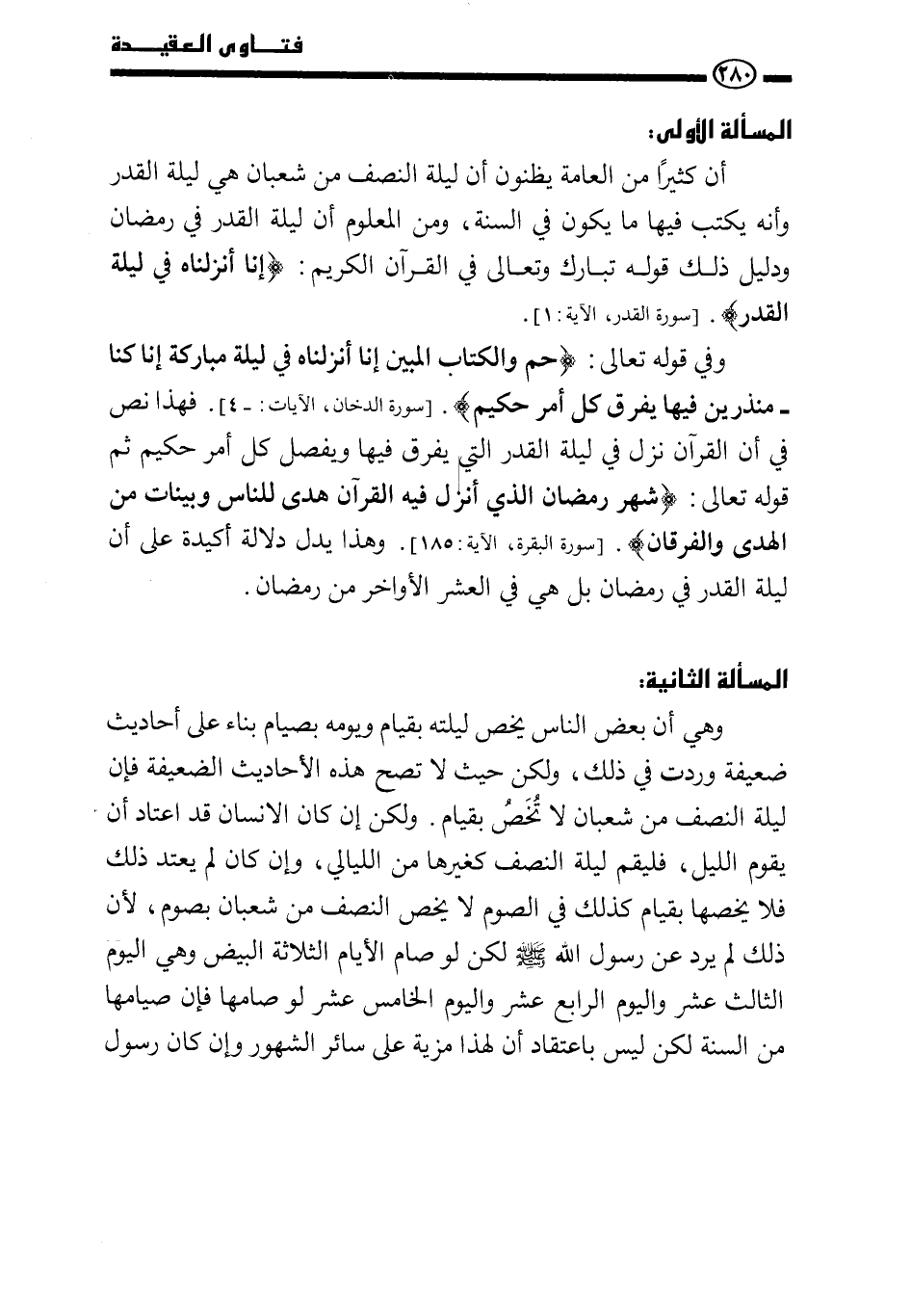 وهي أن بعض الناس يخص ليلته بقيام ويومه بصيام بناء على أحاديث ضعيفة وردت في ذلك، ولكن حيث لا تصح هذه الأحاديث الضعيفة فإن ليلة النصف من شعبان لا تخص بقيام. ولكن إن كان الإنسان قد اعتاد أن يقوم الليل، فليقم ليلة النصف كغيرها من الليالي، وإن كان لم يعتد ذلك فلا يخصها بقيام كذلك في الصوم لا يخص النصف من شعبان بصوم، لأن ذلك لم يرد عن رسول الله- صَلَّى اللَّهُ عَلَيْهِ وَسَلَّمَ- لكن لو صام الأيام الثلاثة البيض وهي اليوم الثالث عشر واليوم الرابع عشر واليوم الخامس عشر لو صامها فإن صيامها من السنة لكن ليس باعتقاد أن لهذا مزية على سائر الشهور وإن «كان رسول»
