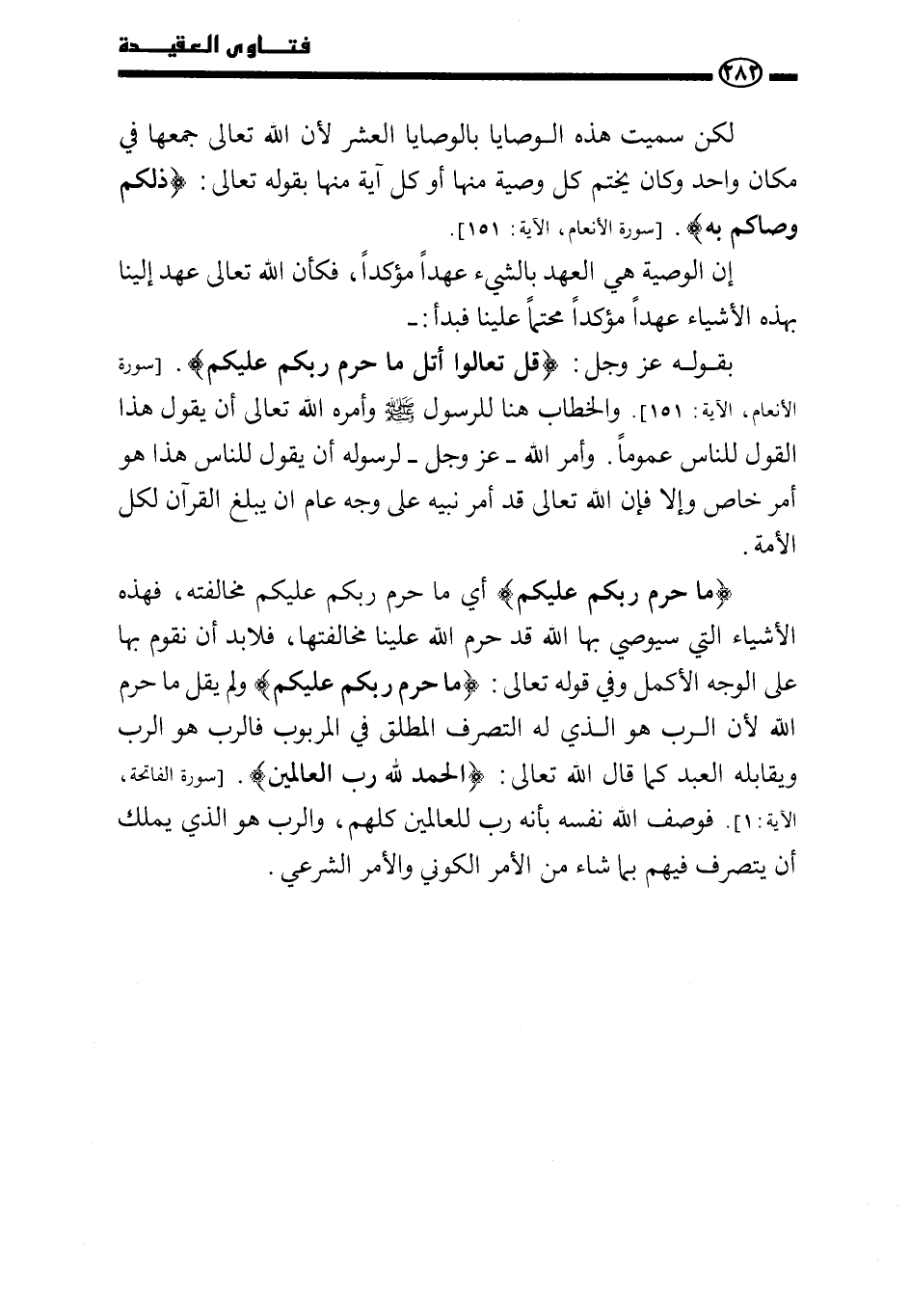 {مَا حَرَّمَ رَبُّكُمْ عَلَيْكُمْ} أي ما حرم ربكم عليكم مخالفته، فهذه الأشياء التي سيوصي بها الله قد حرم الله علينا مخالفتها، فلا بد أن نقوم بها على الوجه الأكمل وفي قوله تعالى: {مَا حَرَّمَ رَبُّكُمْ عَلَيْكُمْ} ولم يقل: ما حرم الله لأن الرب هو الذي له التصرف المطلق في المربوب فالرب هو الرب ويقابله العبد كما قال الله تعالى: {الْحَمْدُ لِلَّهِ رَبِّ الْعَالَمِينَ} [سورة الفاتحة، الآية:1] فوصف الله نفسه بأنه رب للعالمين كلهم، والرب هو الذي يملك أن يتصرف فيهم بما شاء من الأمر الكوني والأمر الشرعي.