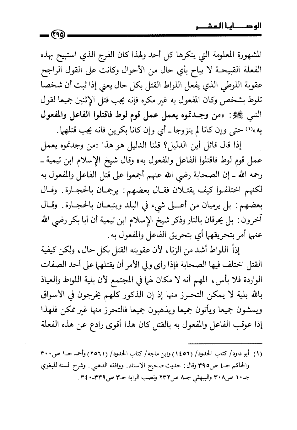 المشهورة المعلومة التي ينكرها كل أحد ولهذا كان الفرج الذي استبيح بهذه الفعلة القبيحة لا يباح بأي حال من الأحوال وكانت على القول الراجح عقوبة اللوطي الذي يفعل اللواط القتل بكل حال يعني إذا ثبت أن شخصا تلوط بشخص، وكان المفعول به غير مكره فإنه يجب قتل الاثنين جميعا لقول النبي صَلَّى اللَّهُ عَلَيْهِ وَسَلَّمَ: «من وجدتموه يعمل عمل قوم لوط فاقتلوا الفاعل والمفعول به» (¬1) حتى وإن كانا لم يتزوجا - أي وإن كانا بكرين - فإنه يجب قتلهما.