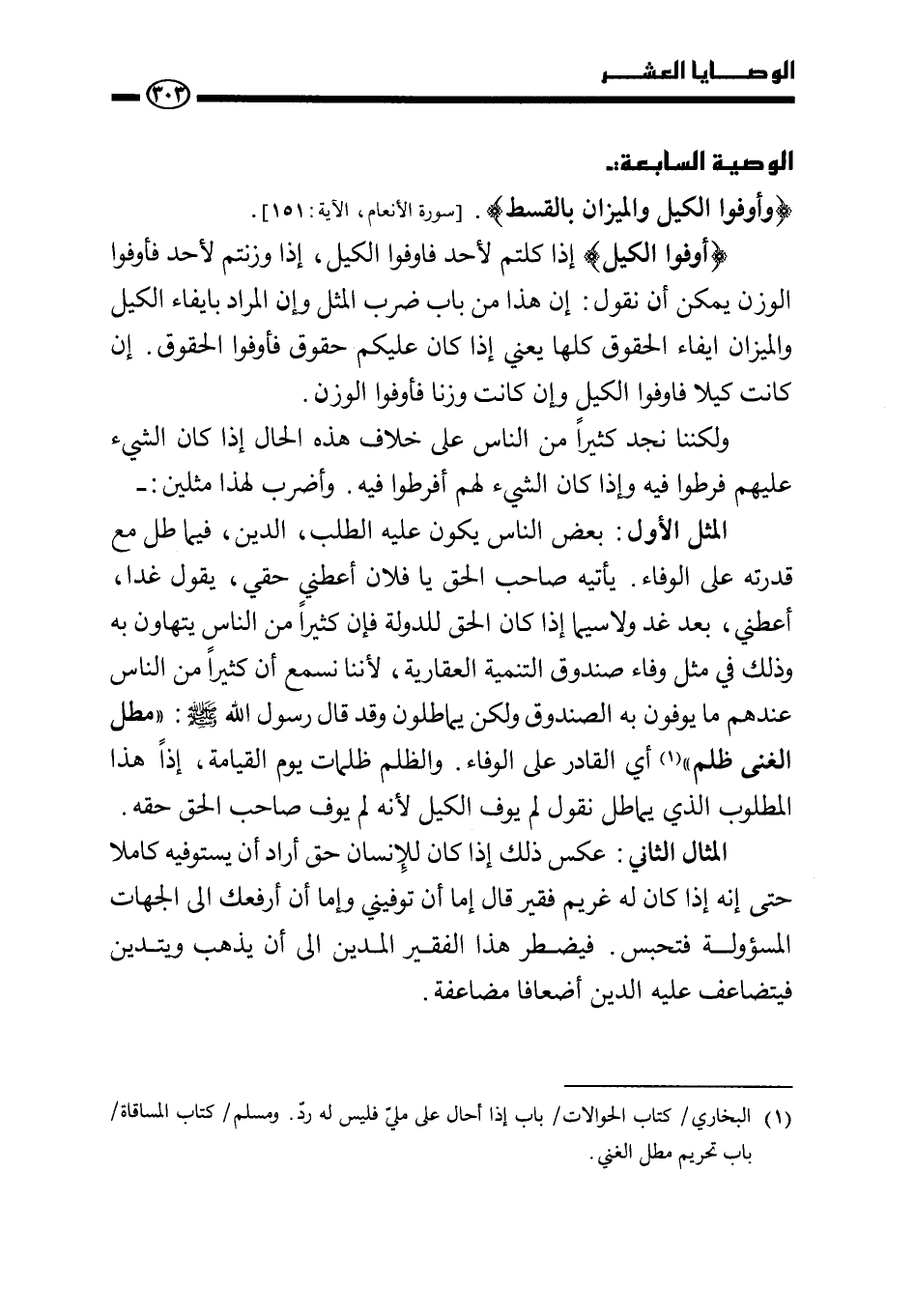 المثل الأول: بعض الناس يكون عليه الطلب، الدين، فيماطل مع قدرته على الوفاء. يأتيه صاحب الحق يا فلان أعطني حقي، يقول: غدا، أعطني، بعد غد ولا سيما إذا كان الحق للدولة فإن كثيرا من الناس يتهاون به وذلك في مثل وفاء صندوق التنمية العقارية، لأننا نسمع أن كثيرا من الناس عندهم ما يوفون به الصندوق ولكن يماطلون وقد قال رسول الله صَلَّى اللَّهُ عَلَيْهِ وَسَلَّمَ: " مطل الغني ظلم" (¬1) أي القادر على الوفاء. والظلم ظلمات يوم القيامة، إذًا هذا المطلوب الذي يماطل نقول: لم يوف الكيل لأنه لم يوف صاحب الحق حقه.