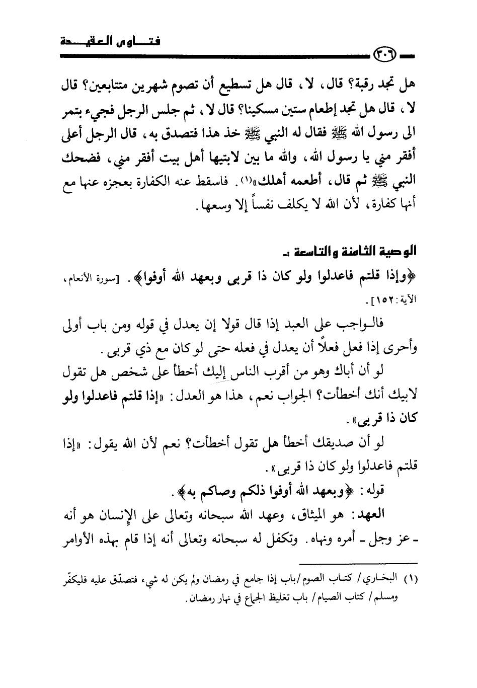 الوصية الثامنة والتاسعة:- {وَإِذَا قُلْتُمْ فَاعْدِلُوا وَلَوْ كَانَ ذَا قُرْبَى وَبِعَهْدِ اللَّهِ أَوْفُوا} [سورة الأنعام، الآية: 152] .