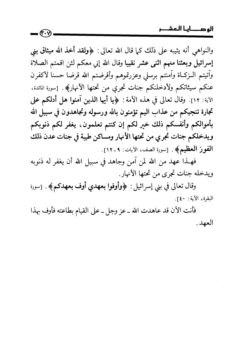 والنواهي أنه يثيبه على ذلك كما قال الله تعالى: {وَلَقَدْ أَخَذَ اللَّهُ مِيثَاقَ بَنِي إِسْرَائِيلَ وَبَعَثْنَا مِنْهُمُ اثْنَيْ عَشَرَ نَقِيبًا وَقَالَ اللَّهُ إِنِّي مَعَكُمْ لَئِنْ أَقَمْتُمُ الصَّلَاةَ وَآتَيْتُمُ الزَّكَاةَ وَآمَنْتُمْ بِرُسُلِي وَعَزَّرْتُمُوهُمْ وَأَقْرَضْتُمُ اللَّهَ قَرْضًا حَسَنًا لَأُكَفِّرَنَّ عَنْكُمْ سَيِّئَاتِكُمْ وَلَأُدْخِلَنَّكُمْ جَنَّاتٍ تَجْرِي مِنْ تَحْتِهَا الْأَنْهَارُ} [سورة المائدة، الآية: 12] وقال تعالى في هذه الأمة: {يَا أَيُّهَا الَّذِينَ آمَنُوا هَلْ أَدُلُّكُمْ عَلَى تِجَارَةٍ تُنْجِيكُمْ مِنْ عَذَابٍ أَلِيمٍ تُؤْمِنُونَ بِاللَّهِ وَرَسُولِهِ وَتُجَاهِدُونَ فِي سَبِيلِ اللَّهِ بِأَمْوَالِكُمْ وَأَنْفُسِكُمْ ذَلِكُمْ خَيْرٌ لَكُمْ إِنْ كُنْتُمْ تَعْلَمُونَ. يَغْفِرْ لَكُمْ ذُنُوبَكُمْ وَيُدْخِلْكُمْ جَنَّاتٍ تَجْرِي مِنْ تَحْتِهَا الْأَنْهَارُ وَمَسَاكِنَ طَيِّبَةً فِي جَنَّاتِ عَدْنٍ ذَلِكَ الْفَوْزُ الْعَظِيمُ} [سورة الصف، الآيات: 10-12] .