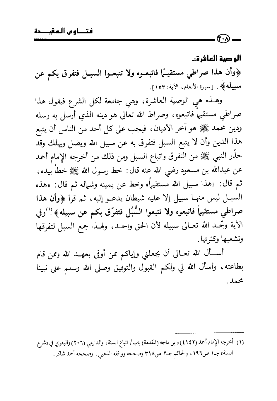 وهذه هي الوصية العاشرة، وهي جامعة لكل الشرع فيقول: هذا صراطي مستقيما فاتبعوه، وصراط الله تعالى هو دينه الذي أرسل به رسله، ودين محمد صَلَّى اللَّهُ عَلَيْهِ وَسَلَّمَ هو آخر الأديان، فيجب على كل أحد من الناس أن يتبع هذا الدين وأن لا يتبع السبل فتفرق به عن سبيل الله ويضل ويهلك وقد حذر النبي صَلَّى اللَّهُ عَلَيْهِ وَسَلَّمَ من التفرق واتباع السبل ومن ذلك ما أخرجه الإمام أحمد عن عبد الله بن مسعود رضي الله عنه قال: «خط رسول الله صَلَّى اللَّهُ عَلَيْهِ وَسَلَّمَ خطا بيده، ثم قال: " هذا سبيل الله مستقيما" وخط عن يمينه وشماله ثم قال: " هذه السبل ليس منها سبيل إلا عليه شيطان يدعو إليه"، ثم قرأ {وَأَنَّ هَذَا صِرَاطِي مُسْتَقِيمًا فَاتَّبِعُوهُ وَلَا تَتَّبِعُوا السُّبُلَ فَتَفَرَّقَ بِكُمْ عَنْ سَبِيلِهِ} » (¬1) وفي الآية وحَّد الله تعالى سبيله لأن الحق واحد، ولهذا جمع السبل لتفرقها وتشعبها وكثرتها.